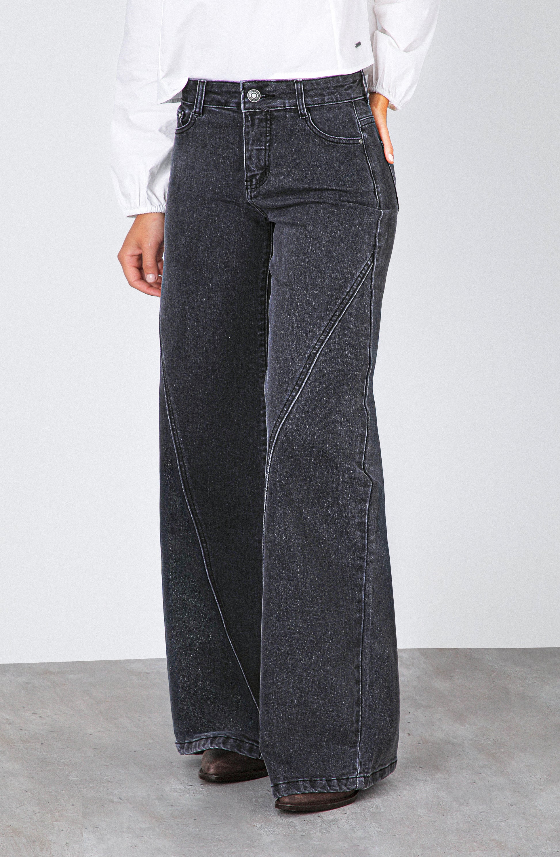 PANTALÓN CORTE PIERNA BLACK de Raindoor es una pieza de denim con carácter y diseño cuidado, pensada para estilizar la figura desde una propuesta moderna y elegante. Su color negro aporta profundidad y versatilidad, mientras el corte wide leg con líneas marcadas en la pierna genera un efecto visual que alarga y define la silueta de forma sutil. El tiro mid rise equilibra el calce, logrando una caída favorecedora y actual.