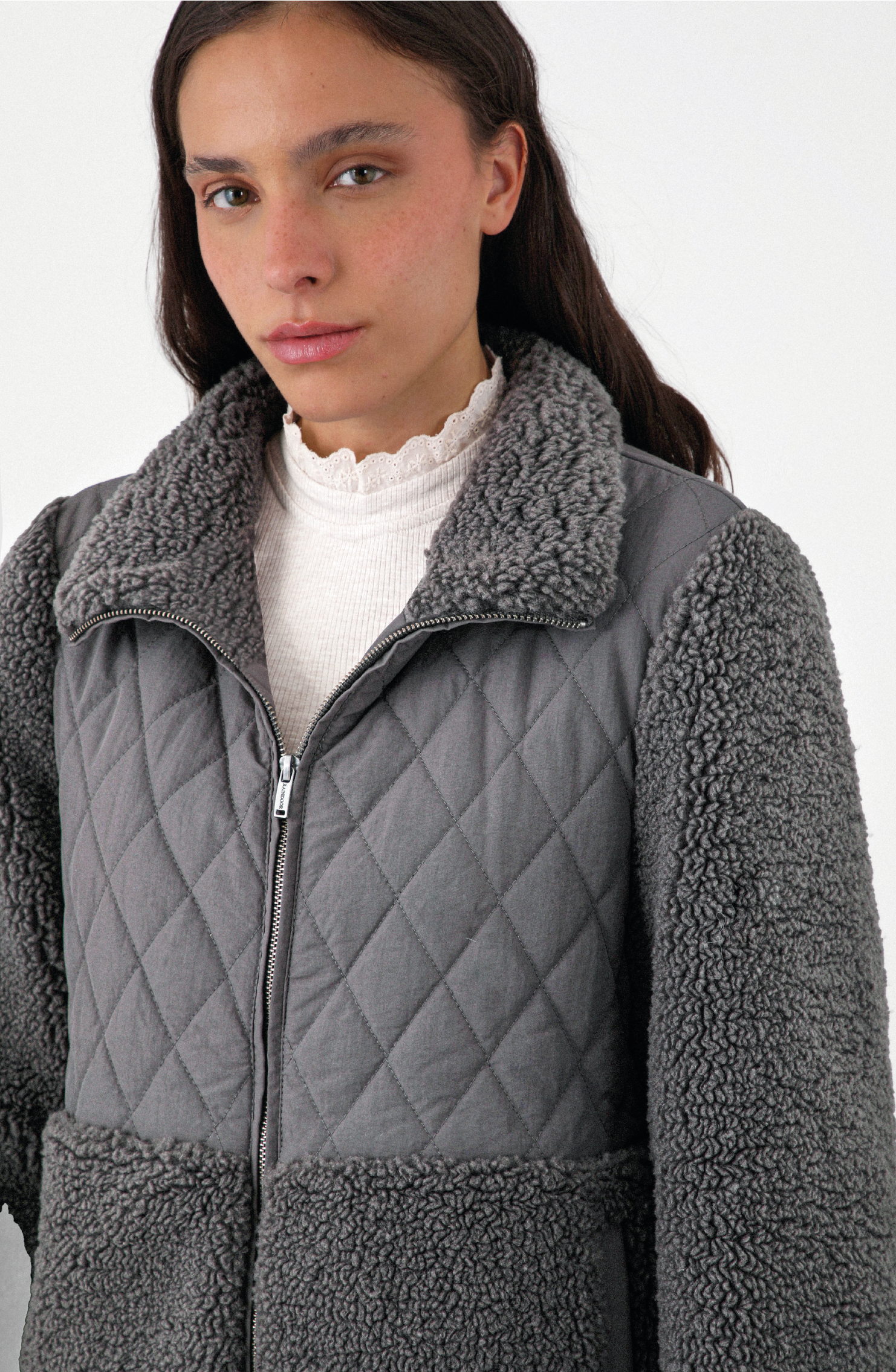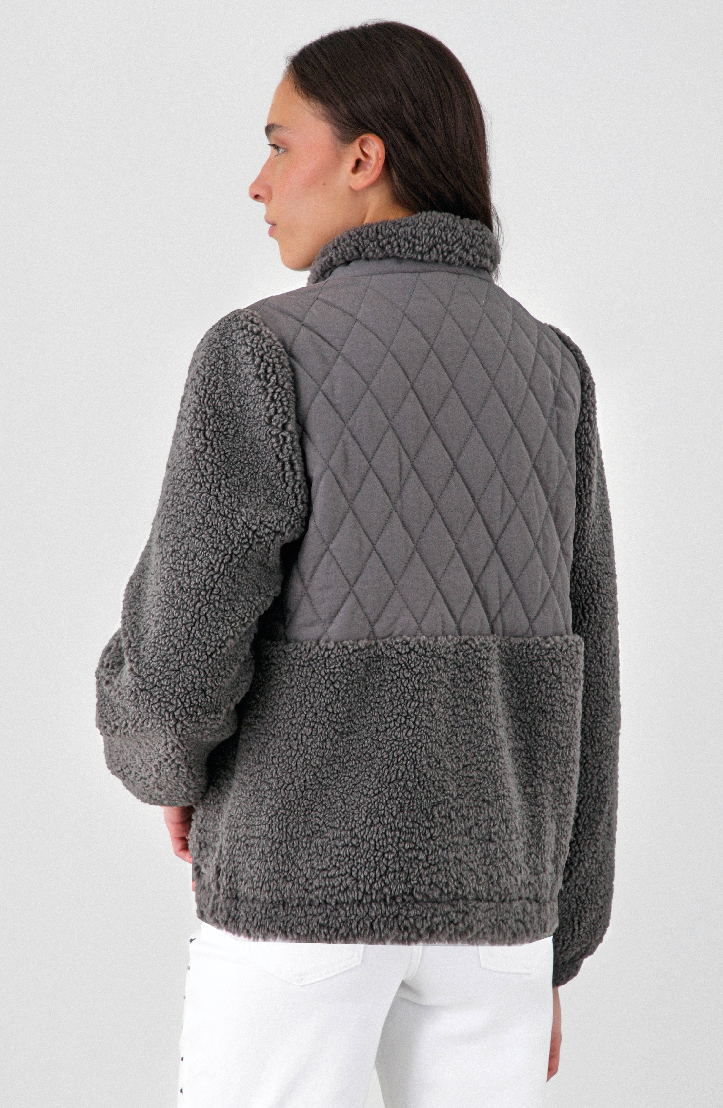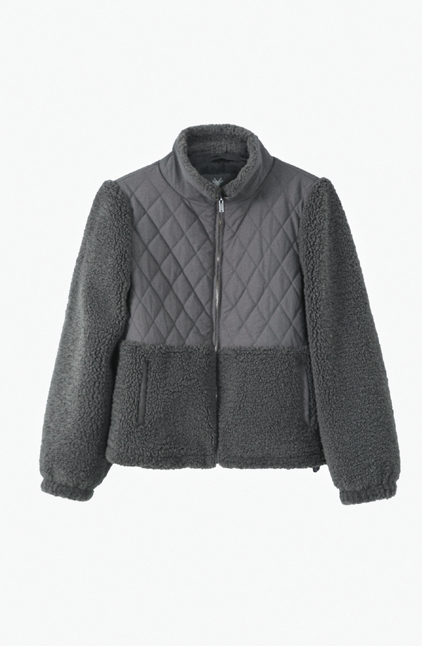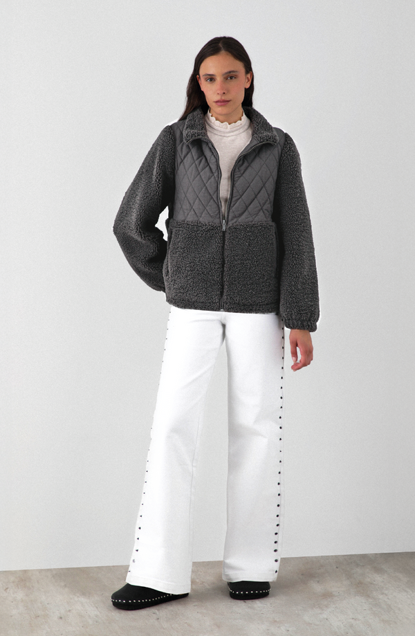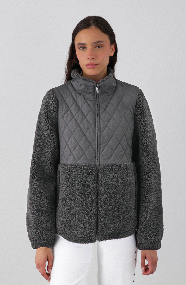 Chaqueta acolchada con chiporro, diseñada para mantener el abrigo sin sacrificar ligereza. Su exterior combina 100% poliamida en la zona acolchada y 100% poliéster sherpa en mangas y parte inferior, logrando una estructura resistente con acabado suave. El interior de 100% poliéster añade confort y calidez. Cierre frontal y cuello alto para mejor cobertura.
