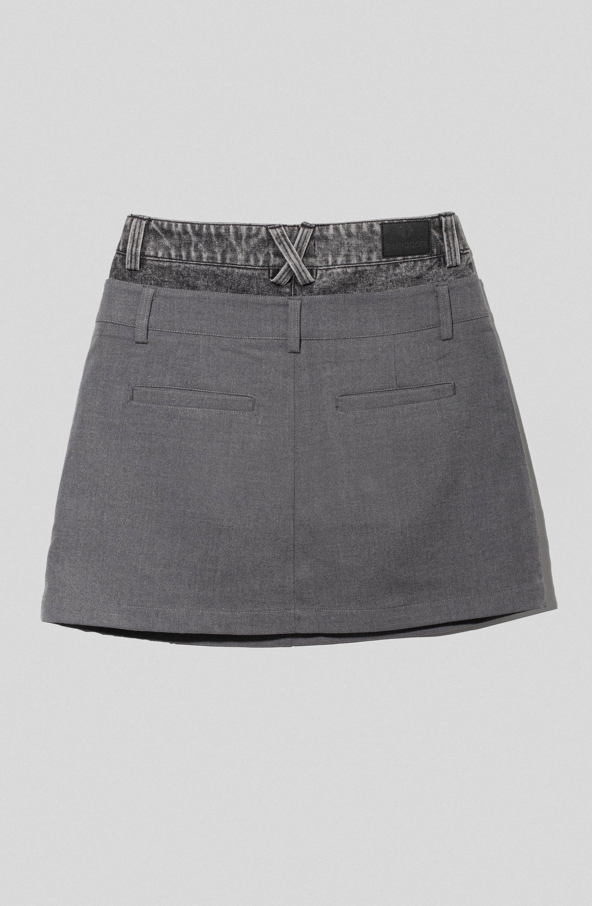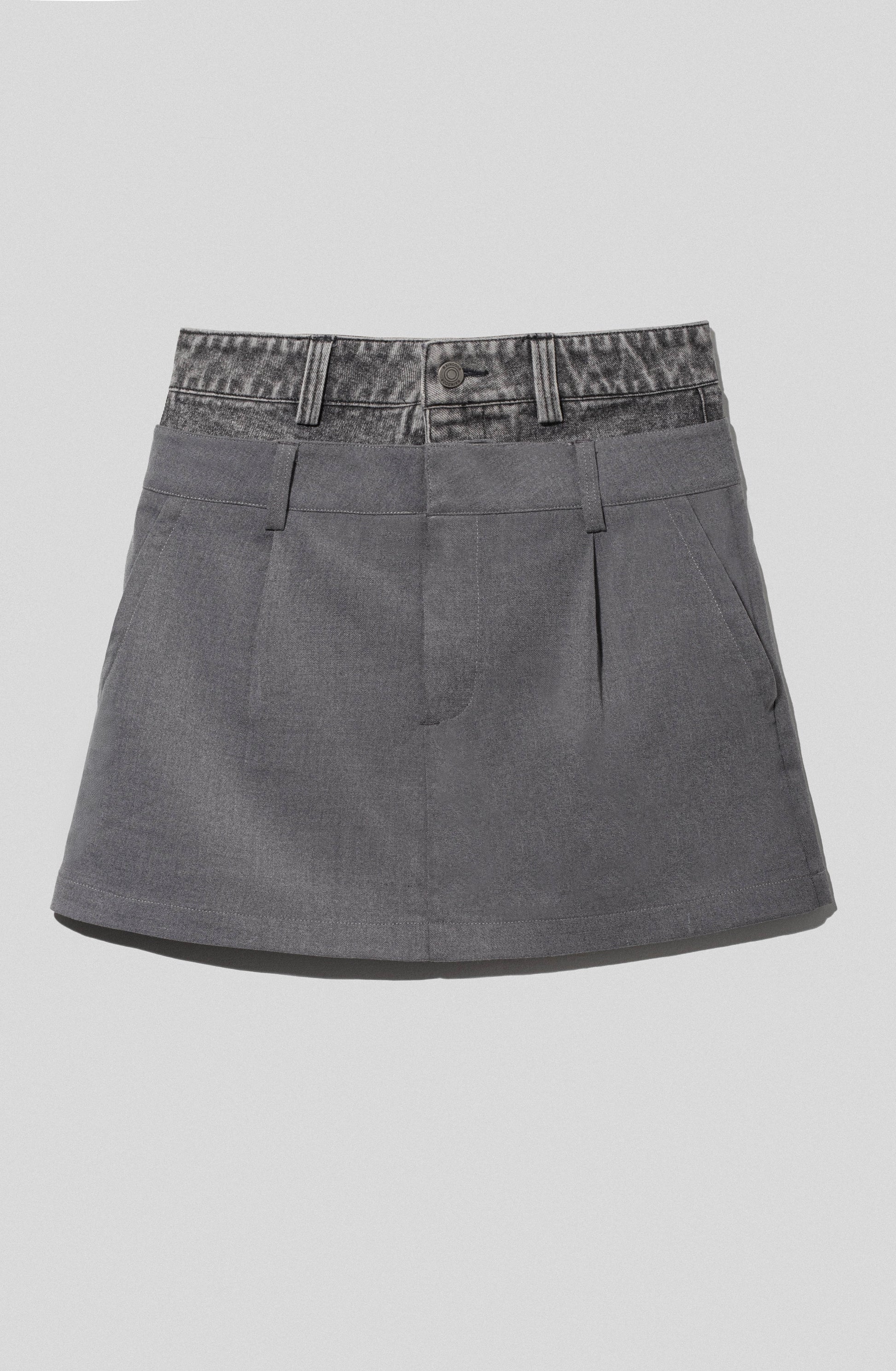 - La falda cuenta con una pretina sastrera en un negro lavado clásico, sobre la que se encuentra una pretina de jeans negro lavado