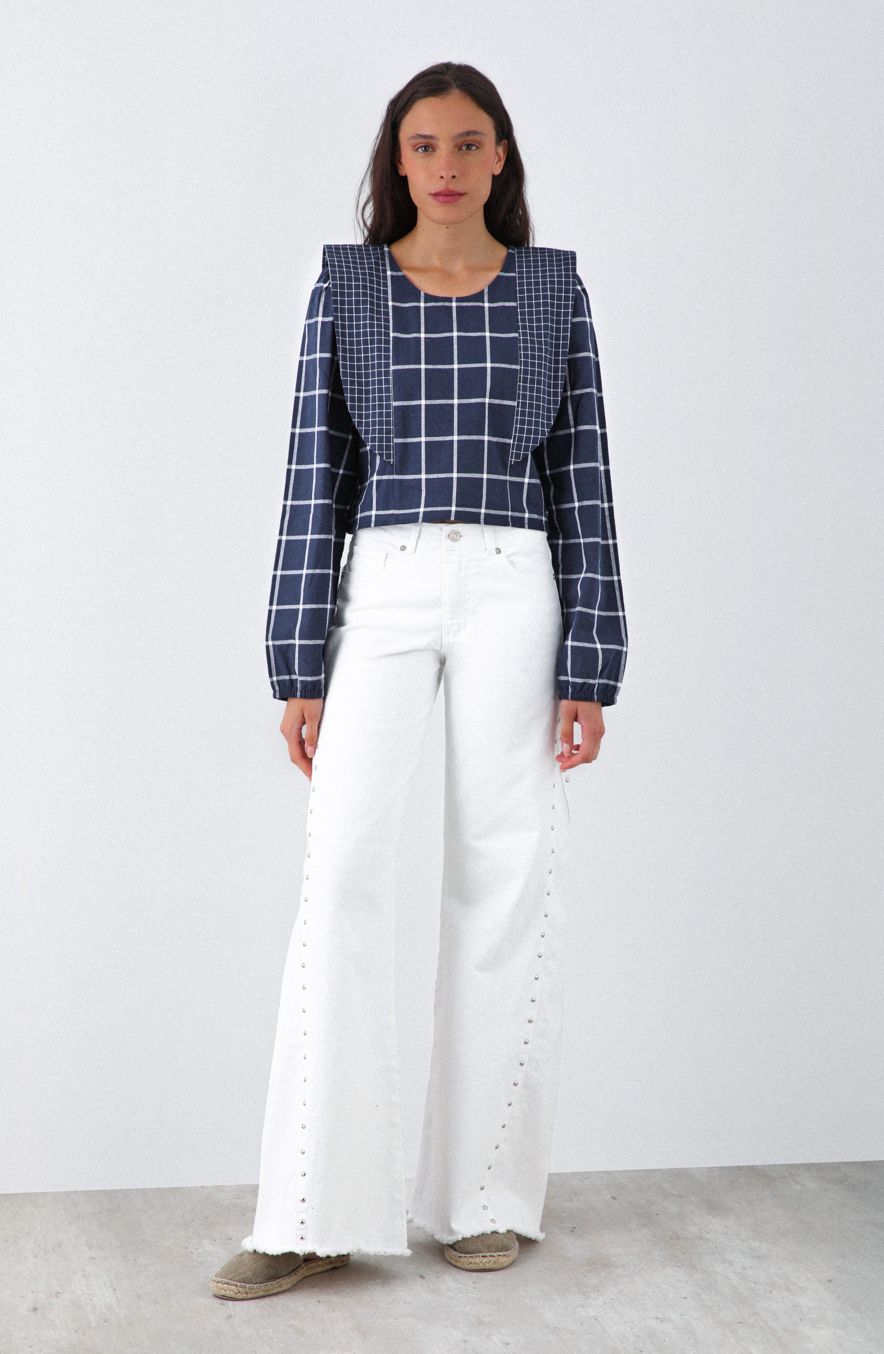 Blusa de algodón mezcla con diseño de cuadros en distintos tamaños. Tiene escote redondo, mangas largas con puño elástico y vuelos en el delantero que marcan la silueta de forma sutil. Su composición de 60% algodón y 40% poliéster con un corte recto y el tejido liviano la hacen fácil de usar con jeans o pantalones más sueltos.