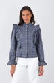 Blusa de calce relajado con estampado de cuadros vichy en tonos gris y azul. Tiene cuello subido, botones al frente y vuelos en los hombros que aportan estructura sin rigidez. Su tela liviana mezcla 60% algodón y 40% poliéster, lo que le da una caída suave pero con cuerpo.