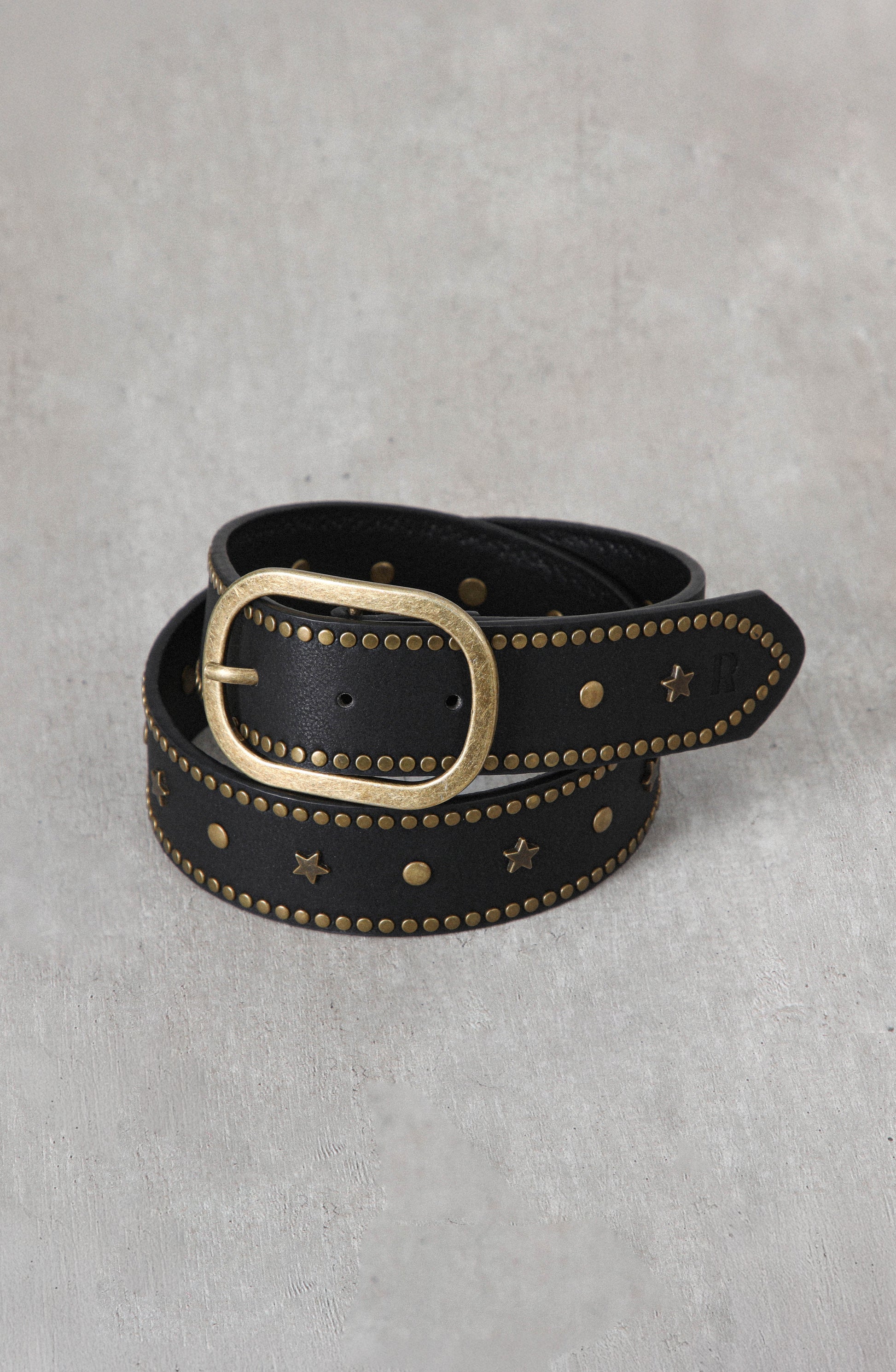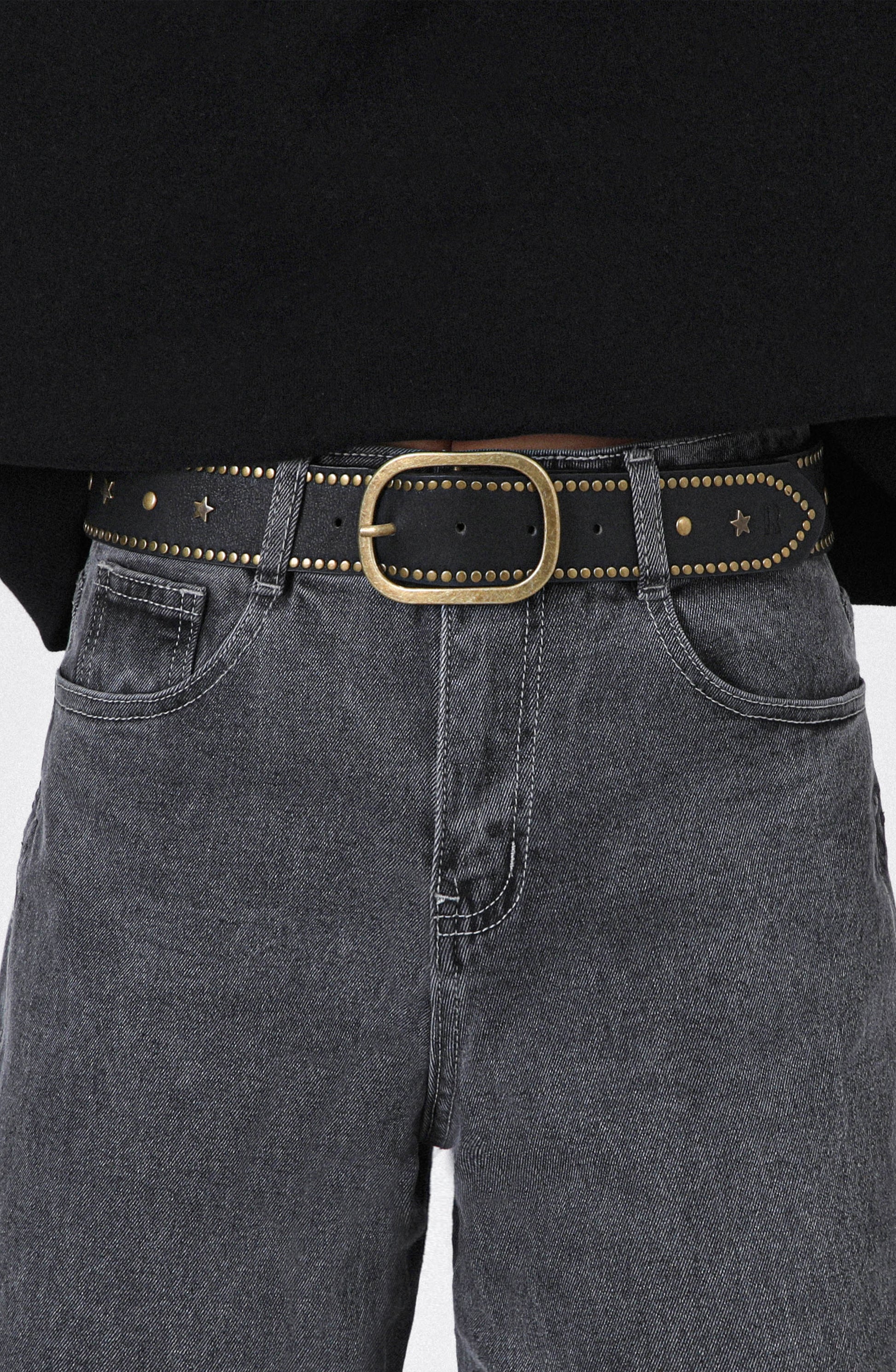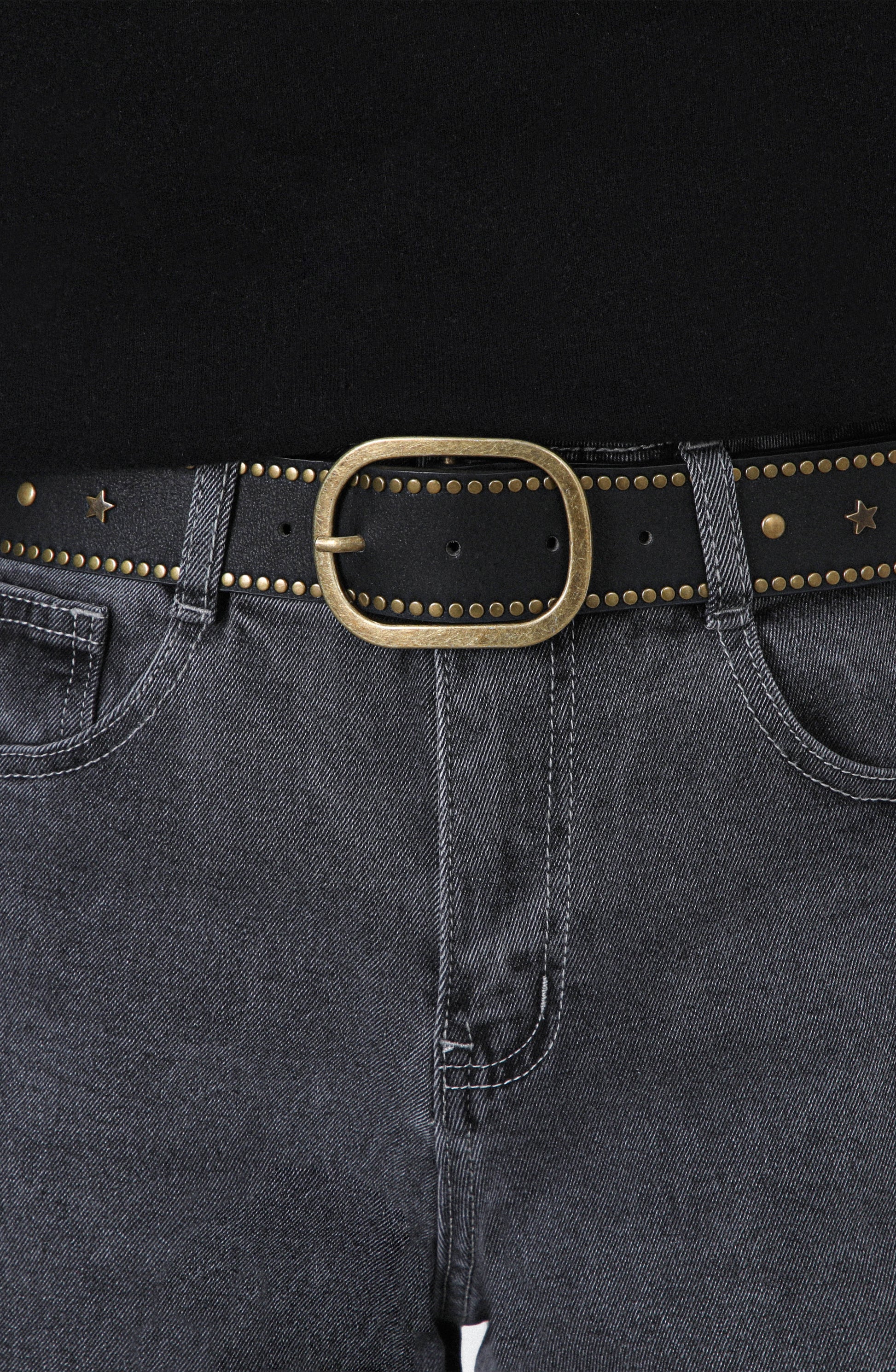 Cinturón Estrellas Tachas Black es un accesorio con carácter que eleva cualquier look. Su diseño en color negro con estrellas y tachas metálicas y hebilla dorado envejecido aporta un toque moderno y sofisticado, ideal para usar con jeans o vestidos.