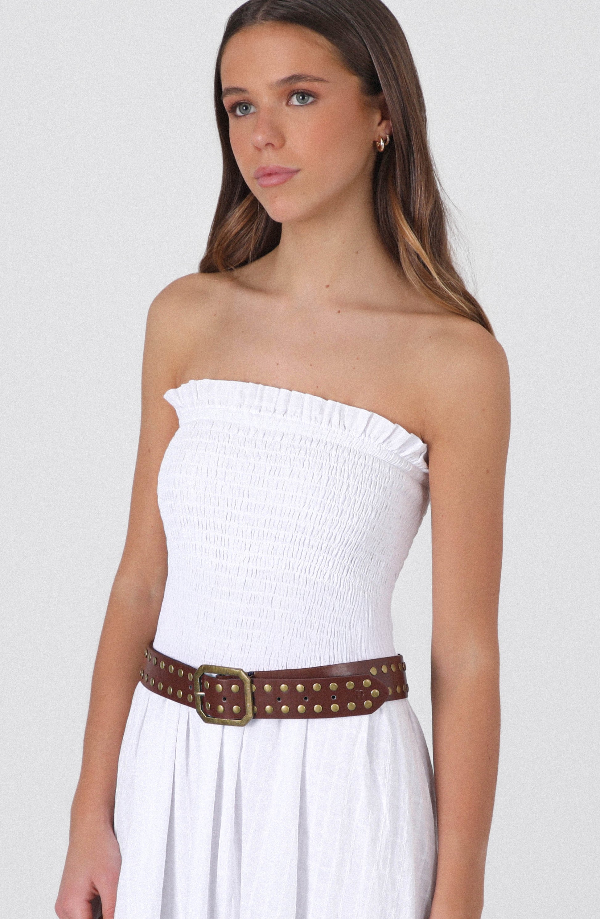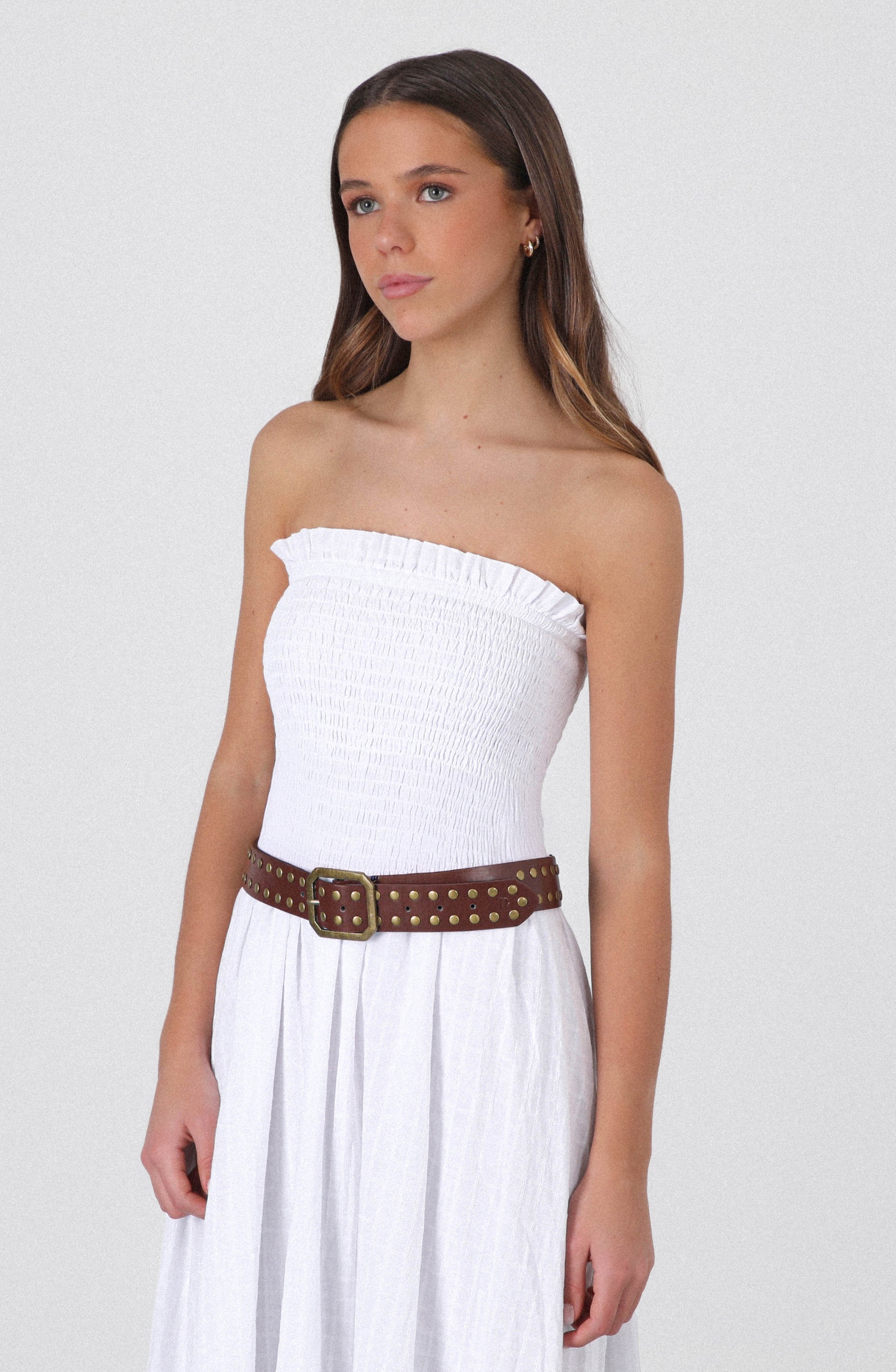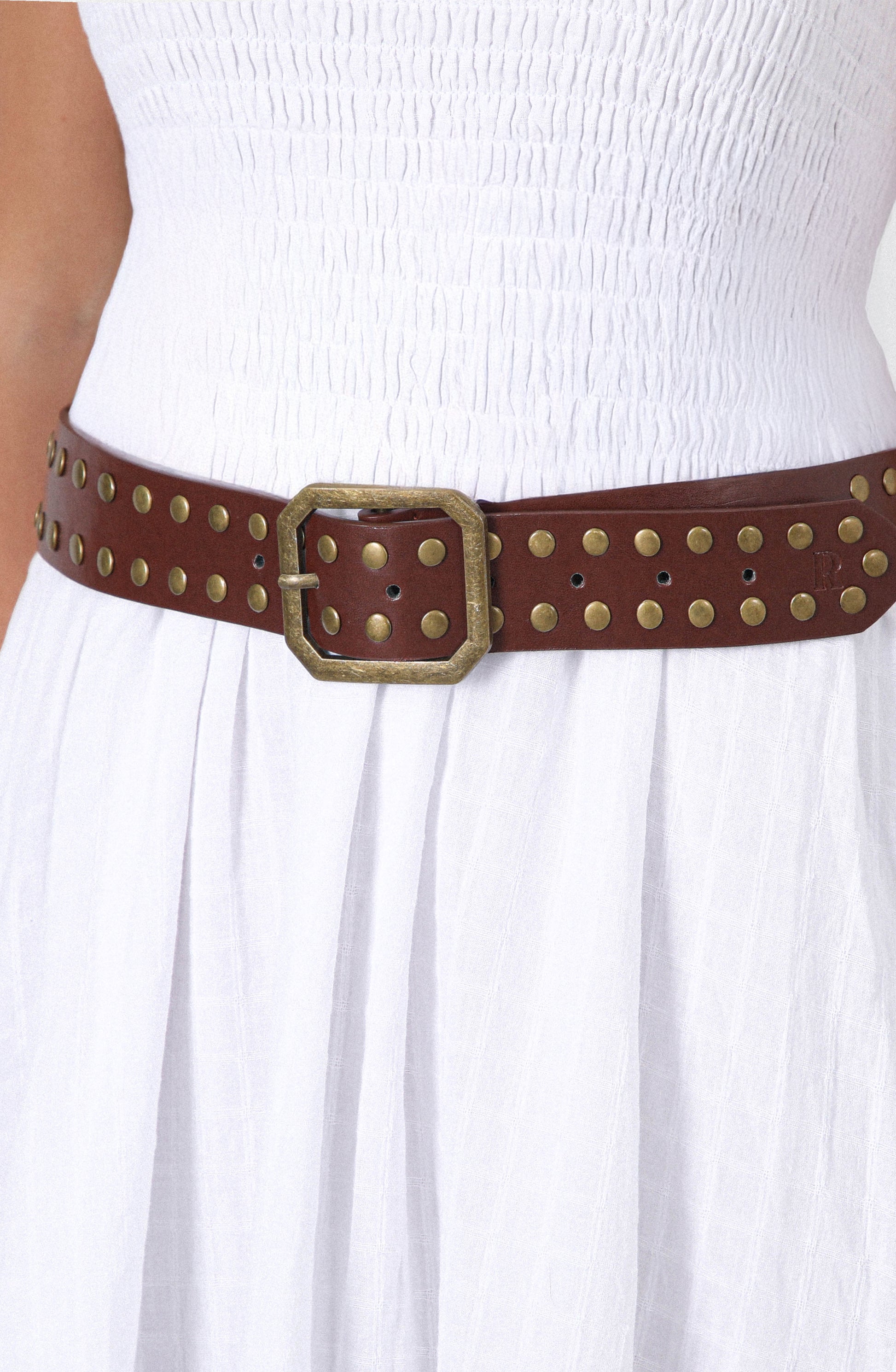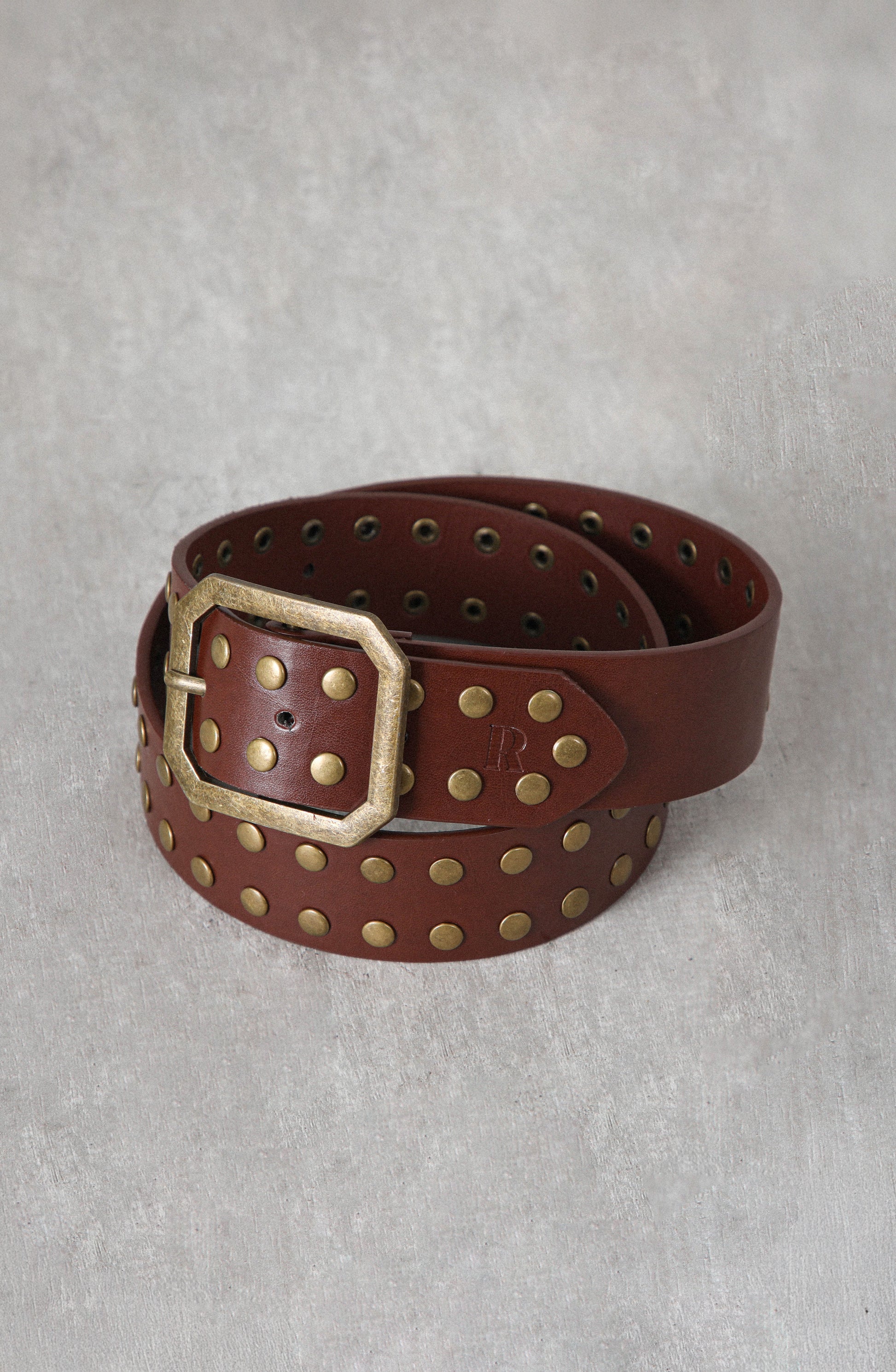 Cinturón Tachas Brown es un accesorio atemporal que combina estilo y carácter en cada detalle. Su tono café oscuro lo convierte en una base versátil para múltiples looks, mientras que las tachas metálicas en todo el contorno aportan un aire moderno y audaz. La hebilla cuadrada con acabado envejecido refuerza su estética distintiva, ideal para complementar desde vestidos hasta jeans de tiro alto.