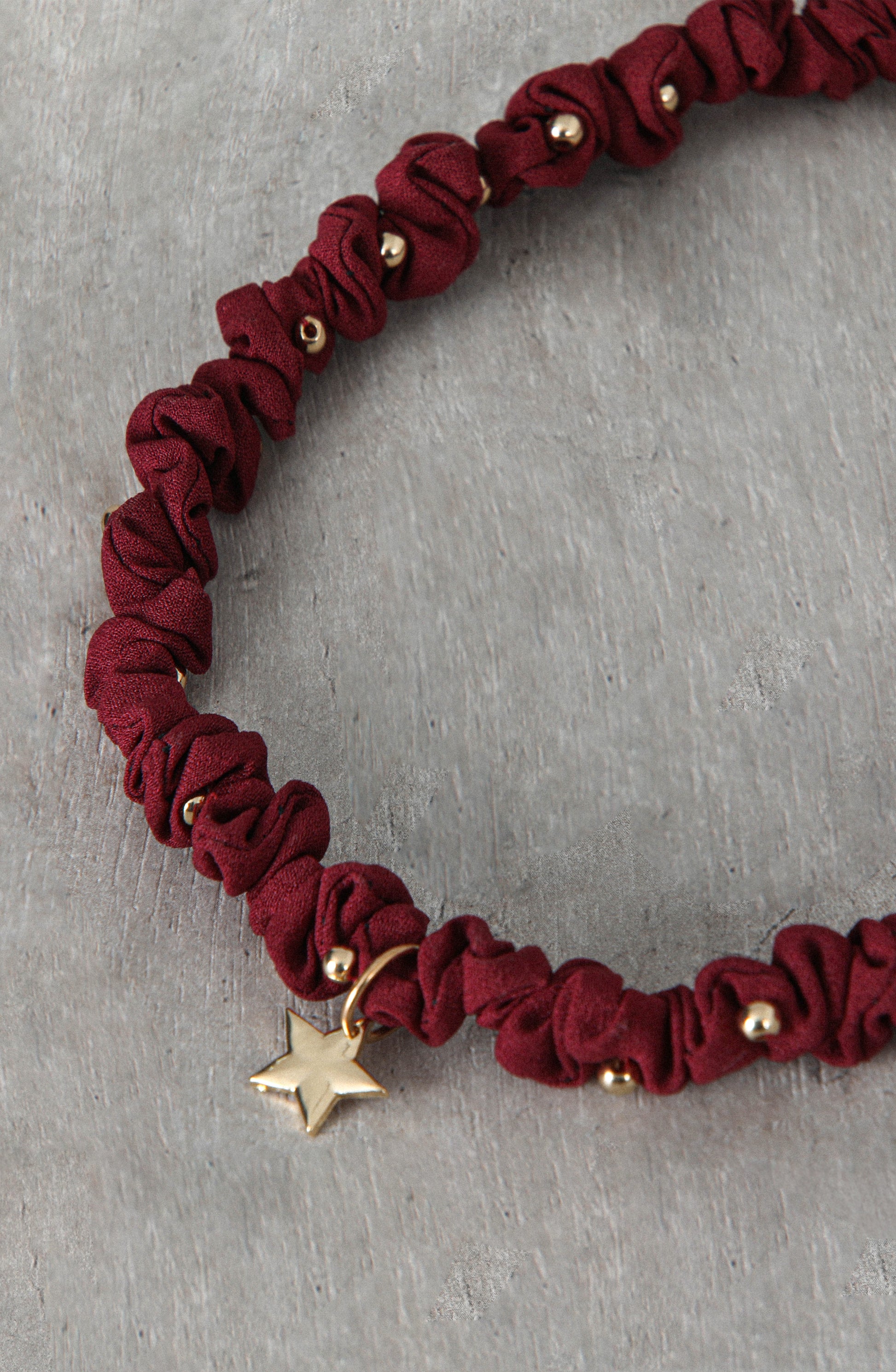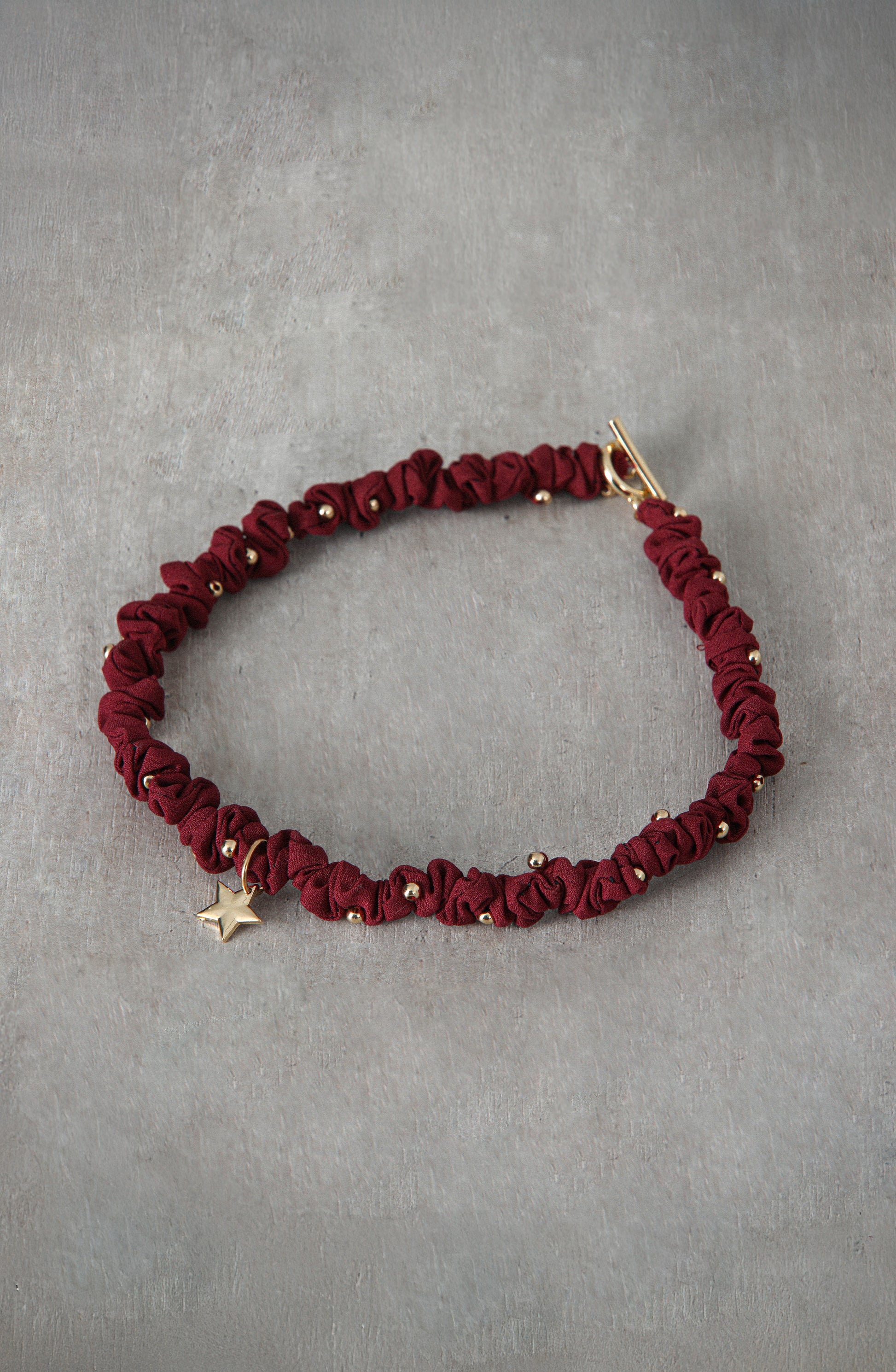 Confeccionado en una combinación de poliéster y aleación de zinc, este collar rojo tejido con estrella asegura resistencia y ligereza. Su estilo artesanal lo convierte en una pieza atemporal que no pasa desapercibida y que puedes llevar como protagonista en outfits de día o de noche.