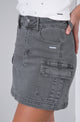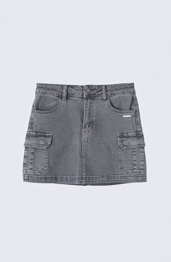 Su largo mini y el bolsillo cargo lateral con botón aportan un detalle funcional y visual que eleva la prenda. El tono gris lavado la convierte en una opción versátil para combinar con básicos neutros o prendas más elevadas. Perfecta para primavera, verano o transiciones de temporada.