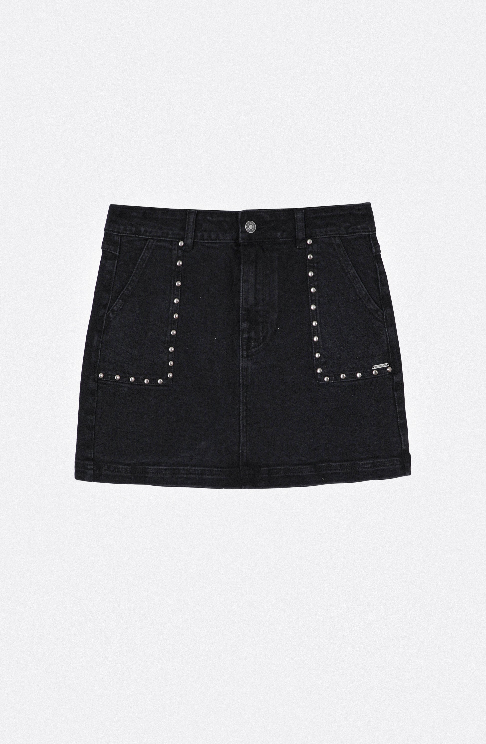Falda Tachas Black es una minifalda de mezclilla en color negro, con un diseño que combina lo clásico del denim con un toque moderno y distintivo. Su silueta recta y estructura firme enmarca la figura de forma natural, mientras que las tachas metálicas dispuestas en patrón lineal sobre los bordes de los bolsillos delanteros añaden un aire audaz y contemporáneo. Un modelo versátil que eleva los looks casuales con un detalle de carácter y estilo.