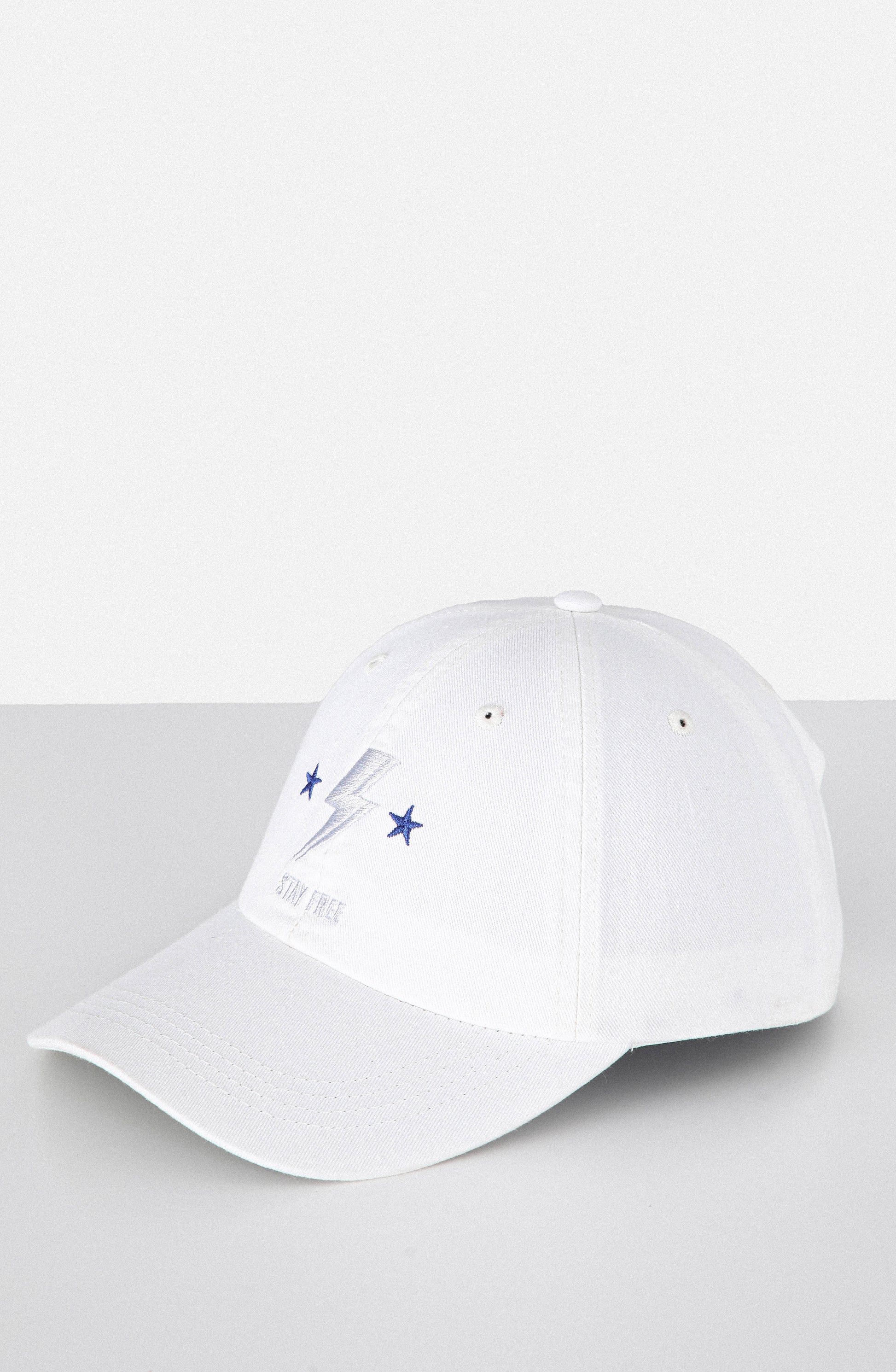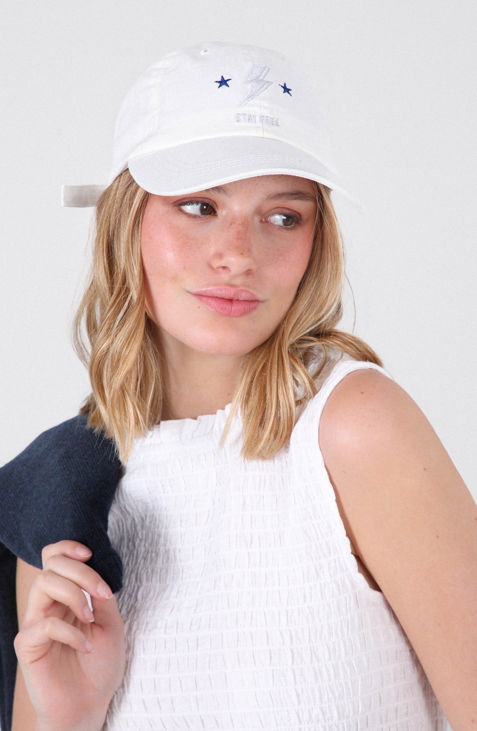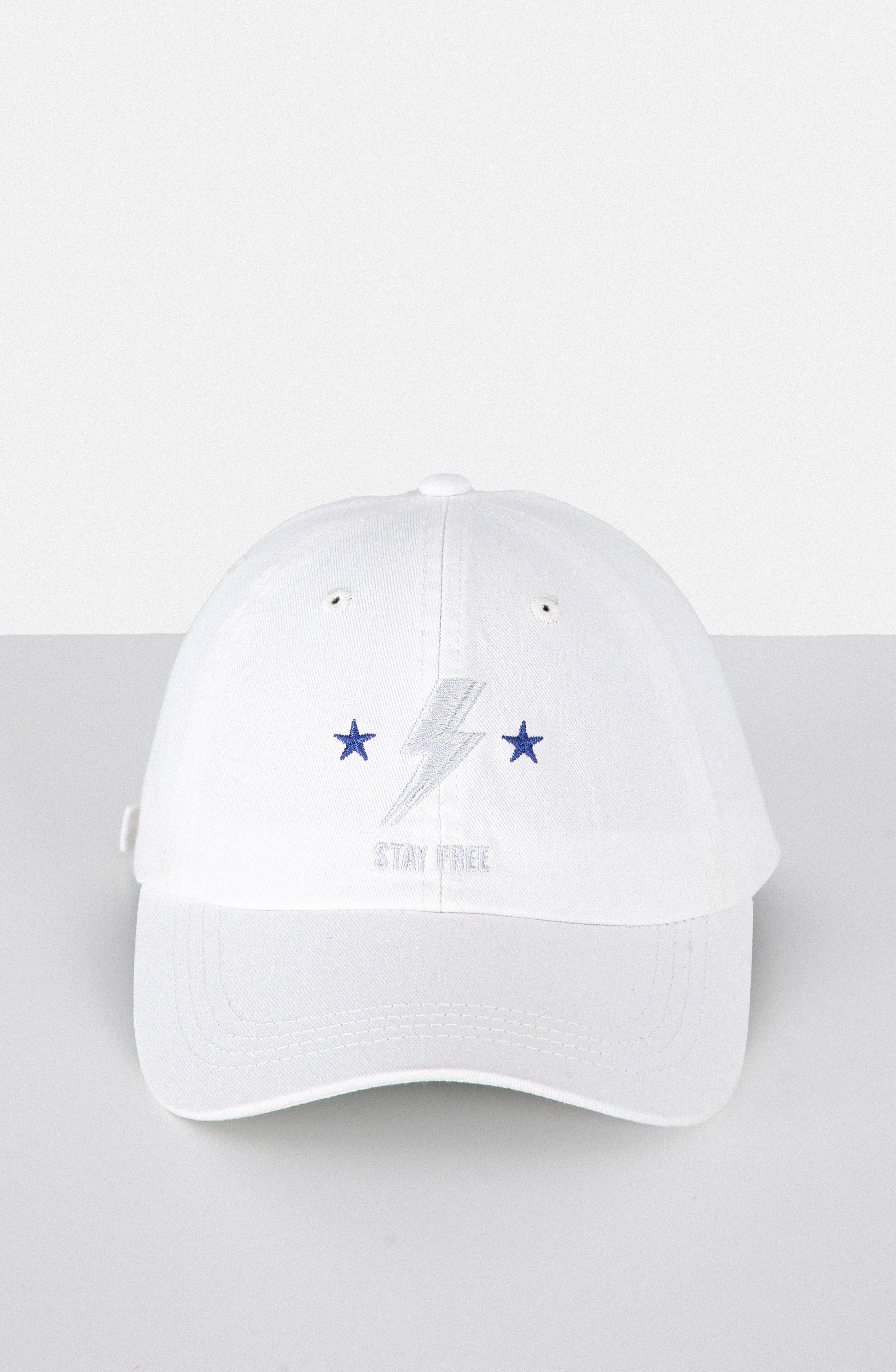 El bordado frontal en hilo azul incluye un rayo central, dos estrellas a los lados y la frase “STAY FREE”, mientras que la parte trasera mantiene un acabado limpio para un look minimalista. Está confeccionado en 100% algodón, lo que lo hace ligero, respirable y perfecto para el uso diario.