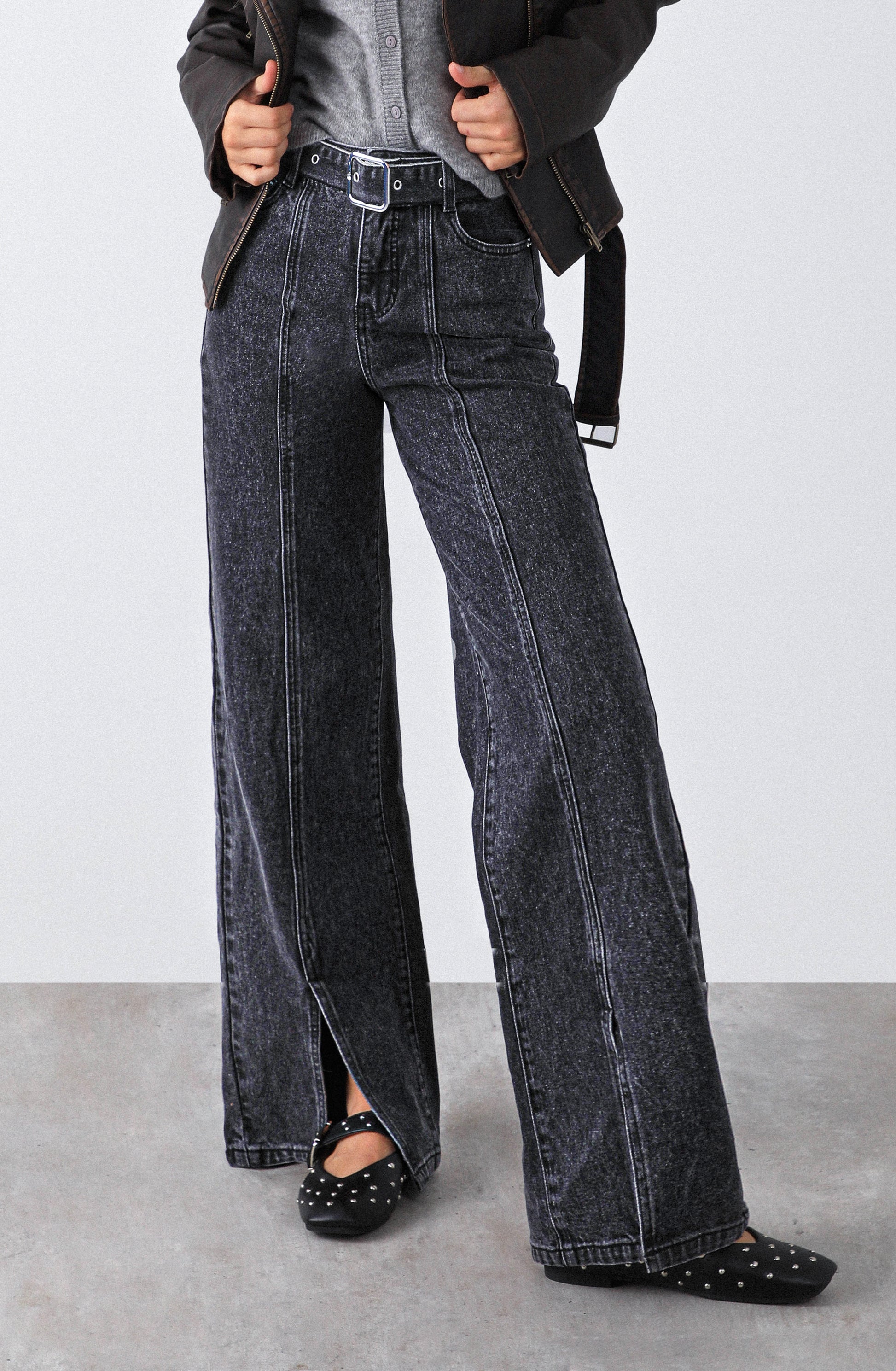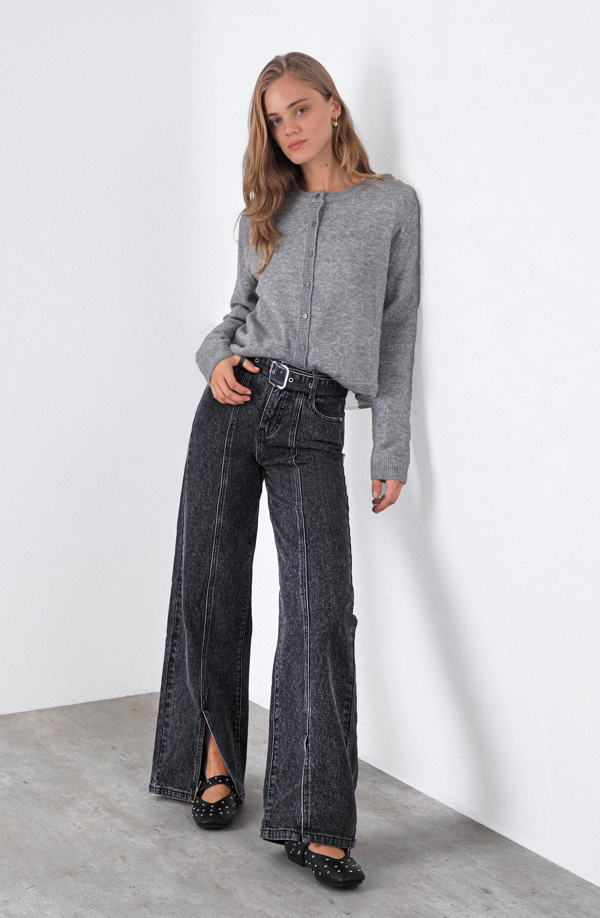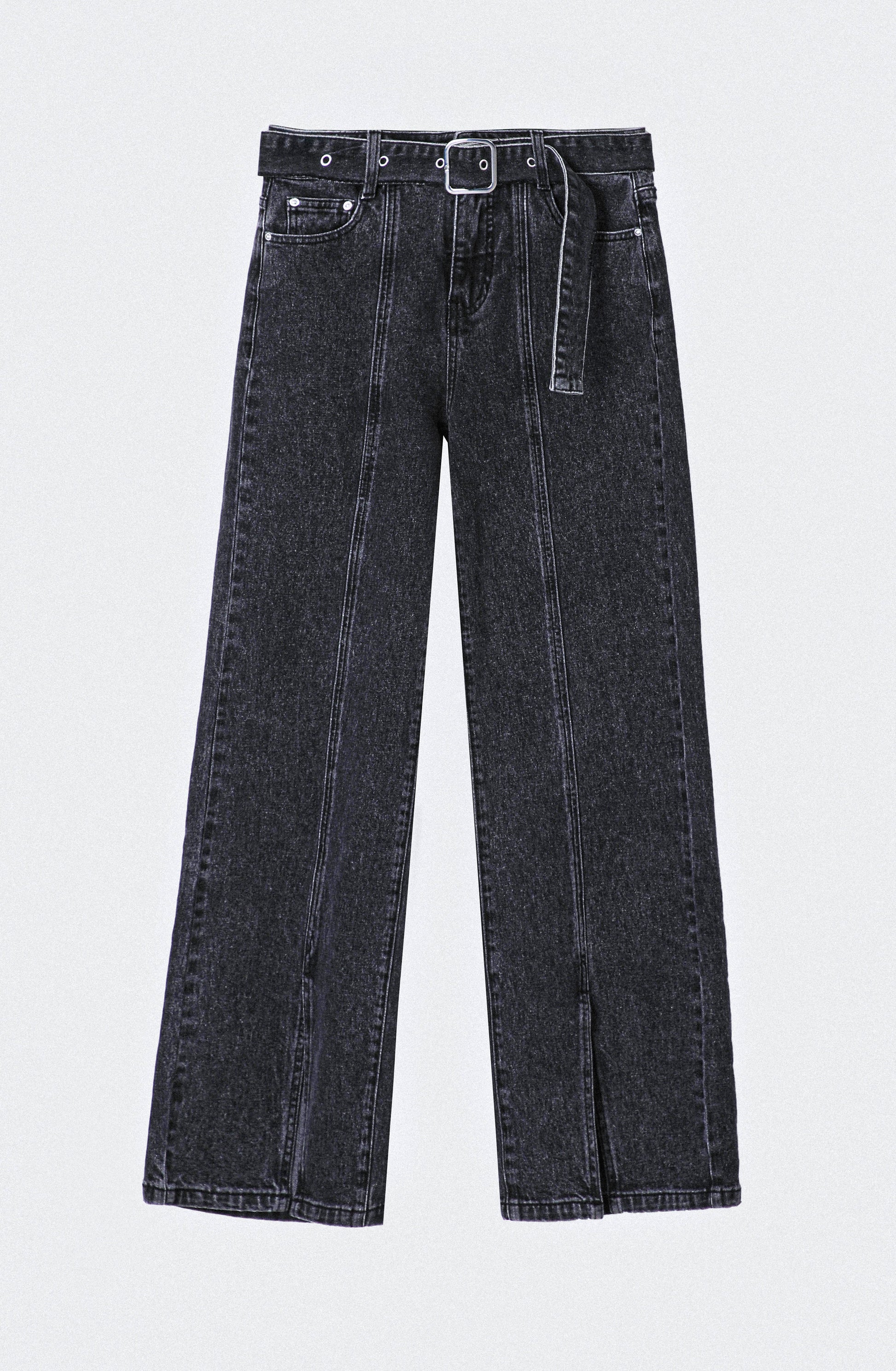 Pantalón Abertura Cinturón Black es un denim negro de tiro medio con silueta straight que equilibra estructura y estilo en una propuesta moderna y femenina. Su diseño incorpora cinturón integrado que acentúa la cintura y costuras frontales que estilizan visualmente la figura. La abertura sutil en el ruedo aporta movimiento y un detalle diferenciador que eleva este básico a una pieza con carácter.