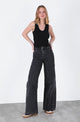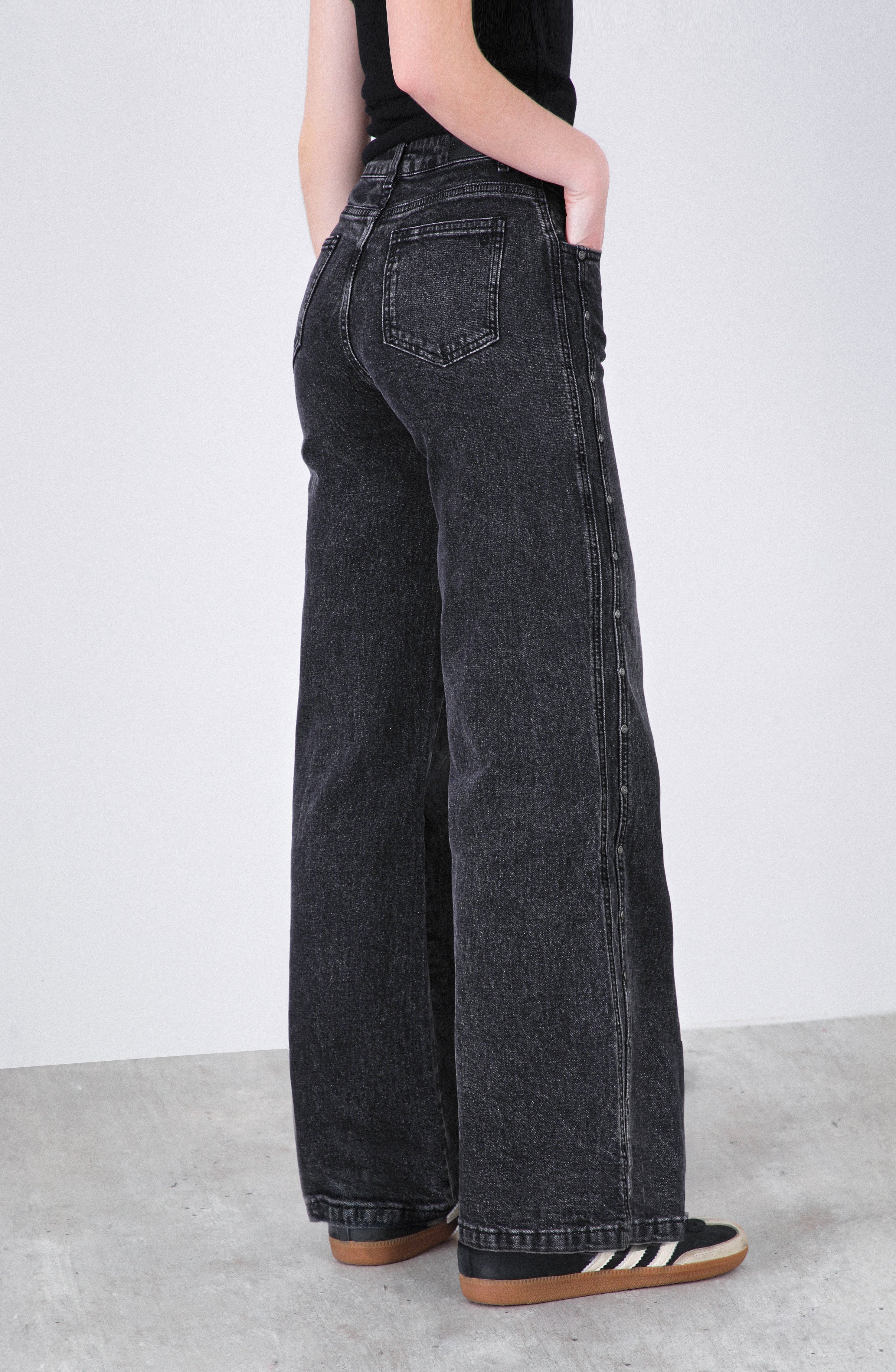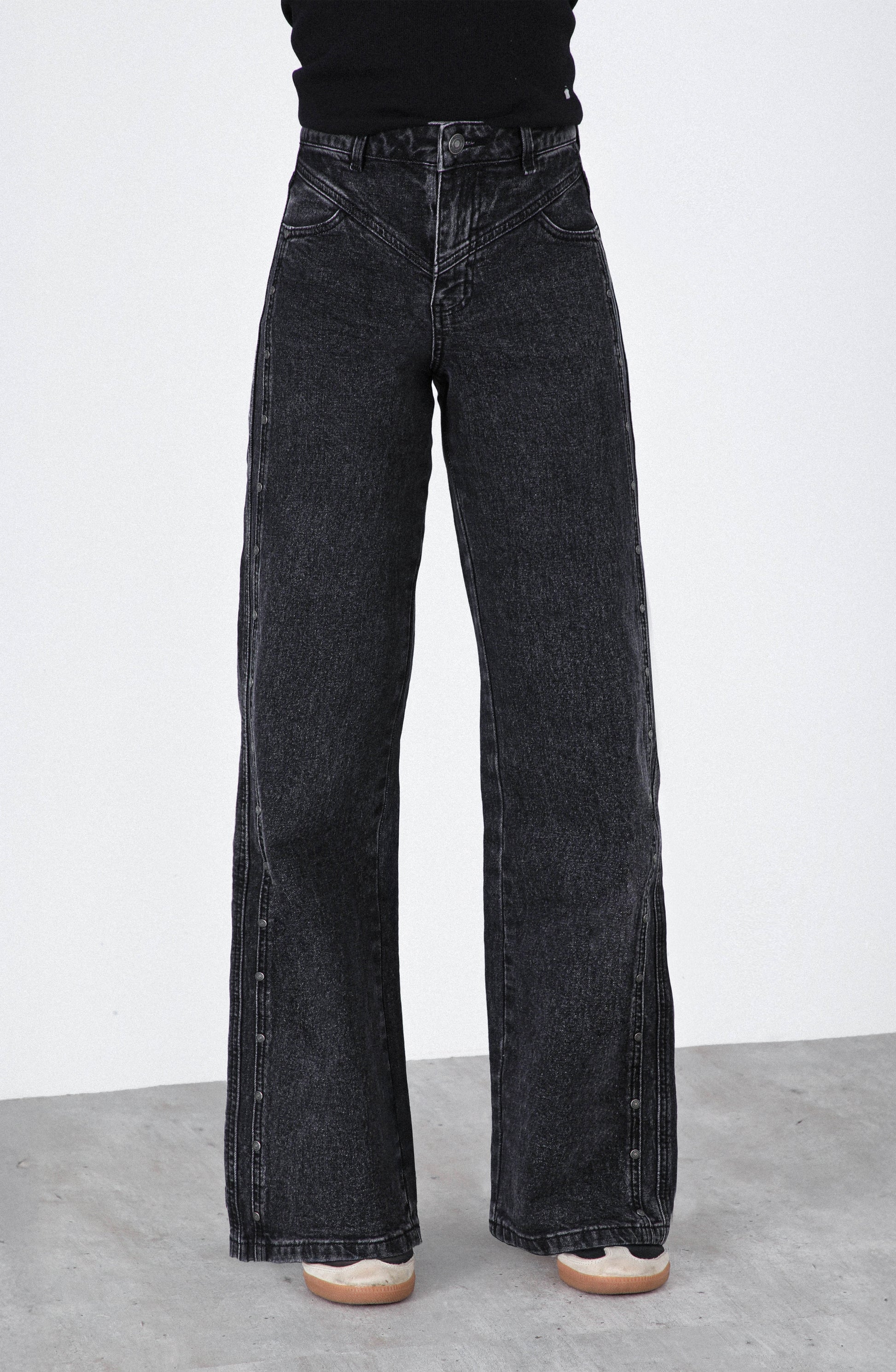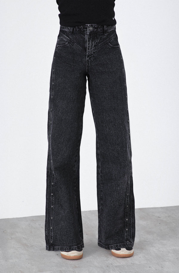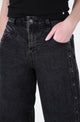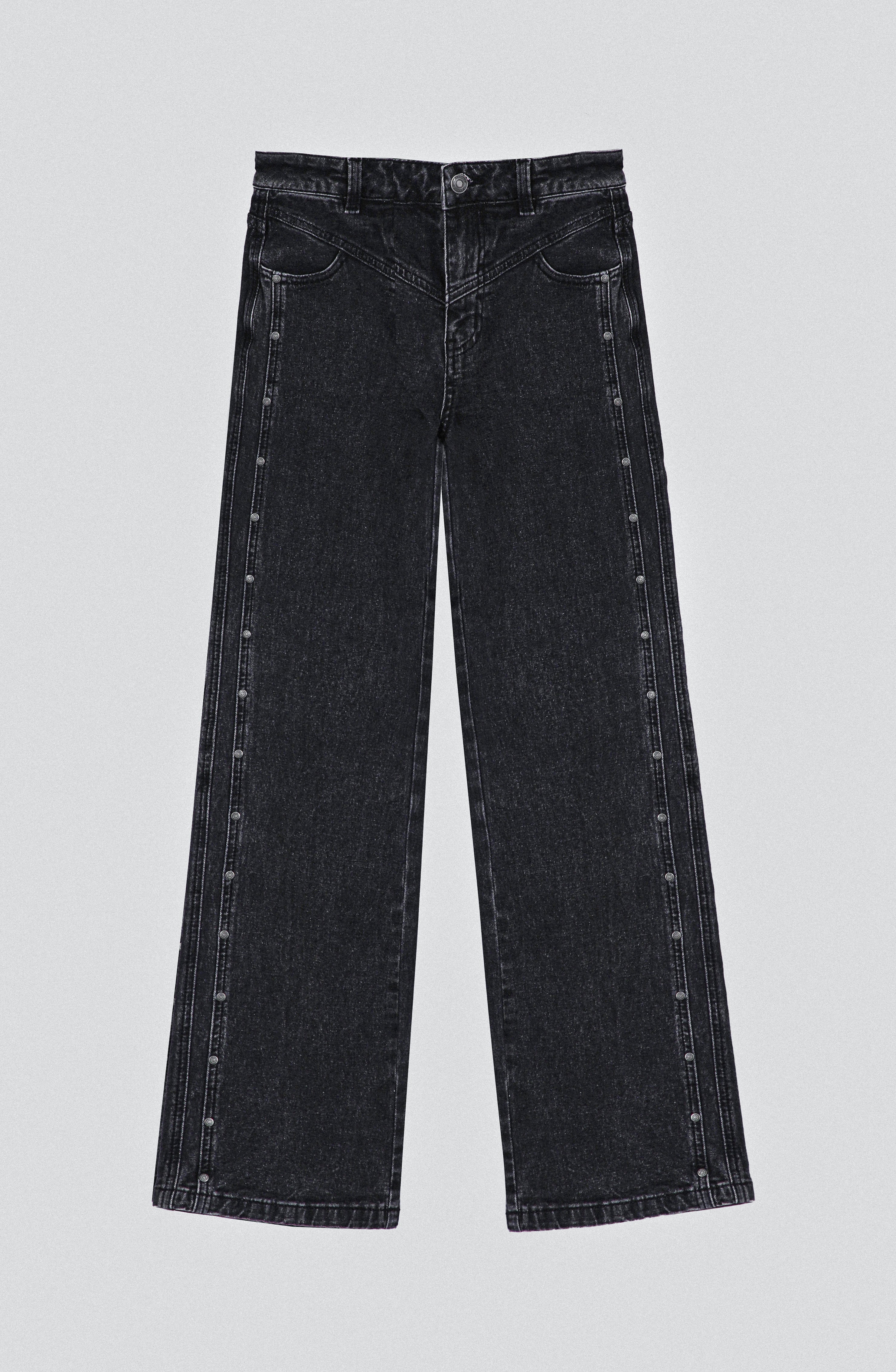 Pantalón Cortes Black es un modelo de tiro medio con calce recto, confeccionado en un denim firme y ligeramente elástico que entrega estructura sin sacrificar comodidad. Su diseño se distingue por un corte limpio con abotonadura decorativa en los costados, que le da un toque moderno y sutil. El tono negro desgastado lo convierte en una prenda versátil para combinar con tops livianos, blusas románticas o chaquetas oversized.