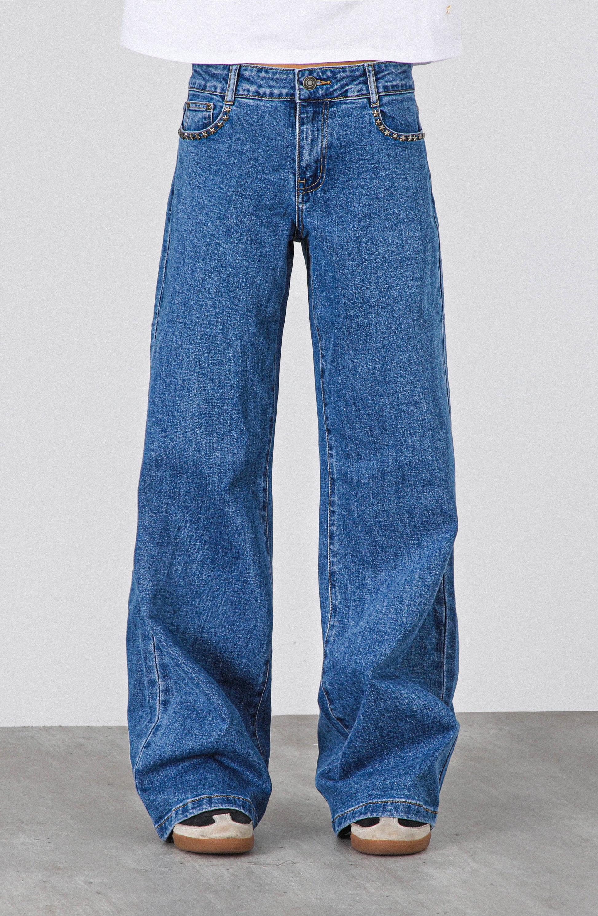 Pantalón Estrella Bolsillo Blue es una prenda versátil y con carácter, pensada para elevar tus looks del día a día con un detalle único. Su silueta de calce relajado con pierna ancha aporta comodidad y estilo, mientras que el diseño clásico de cinco bolsillos se renueva con apliques de estrellas metálicas en los bolsillos delanteros, entregando un aire moderno y atrevido.