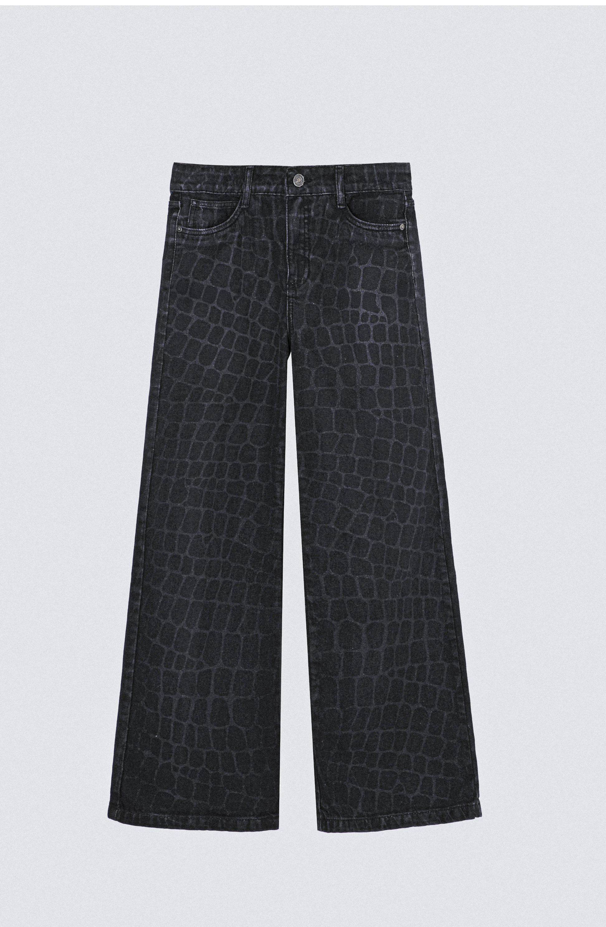 Pantalón Laser Snake es un pantalón negro de tiro medio y fit recto, diseñado para dar un toque diferente al denim clásico. Su diseño destaca por un estampado láser con efecto reptilado, que aporta textura y profundidad sin perder la sobriedad del negro. De calce relajado y estructura firme, mantiene una silueta moderna que estiliza y acompaña el movimiento con naturalidad.