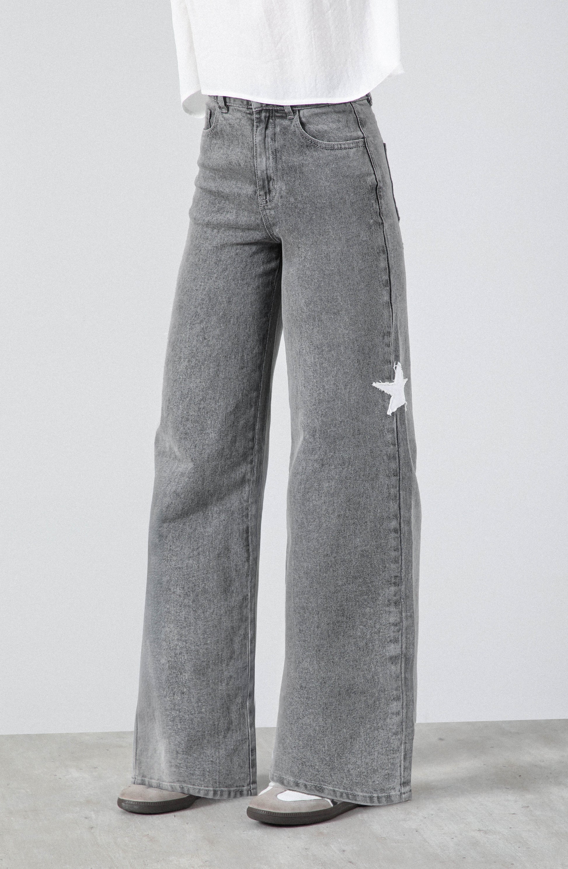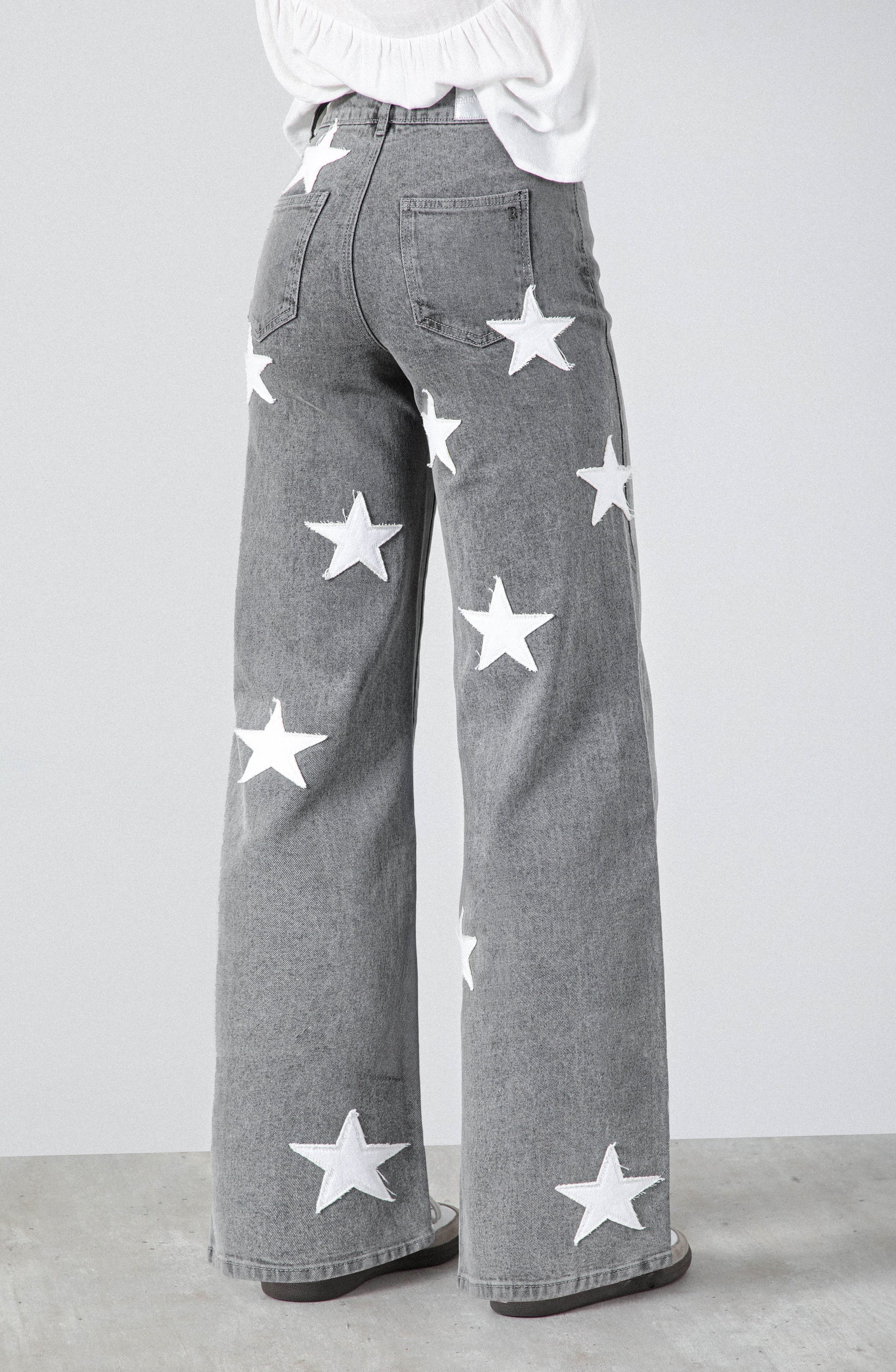 Jeans estilo straight en denim gris con estrellas aplicadas en tono blanco, un toque distintivo y urbano con calce cómodo y versátil. Confeccionado en 98% algodón 2% spandex para un pantalón con ajuste flexible y duradero.