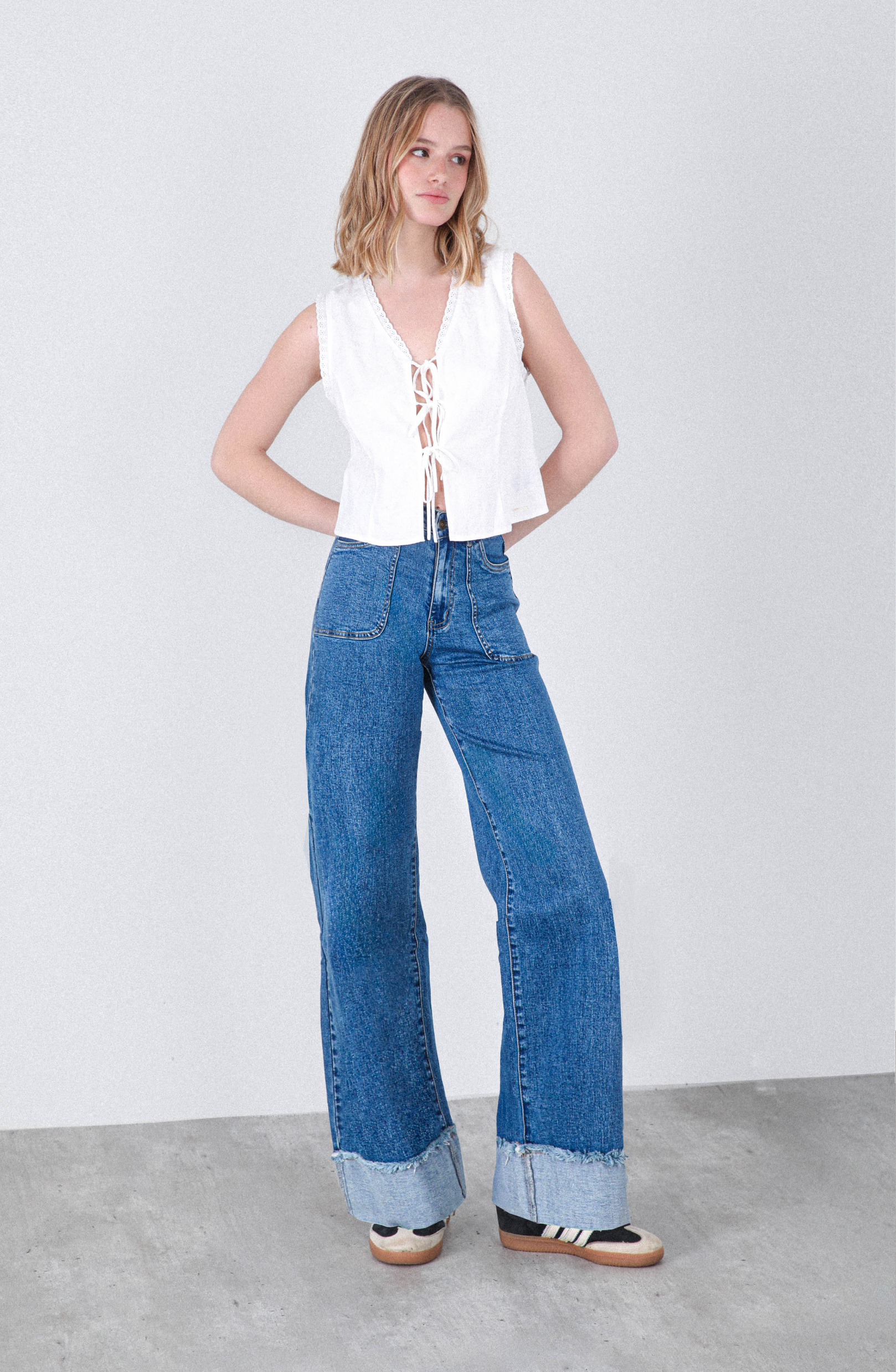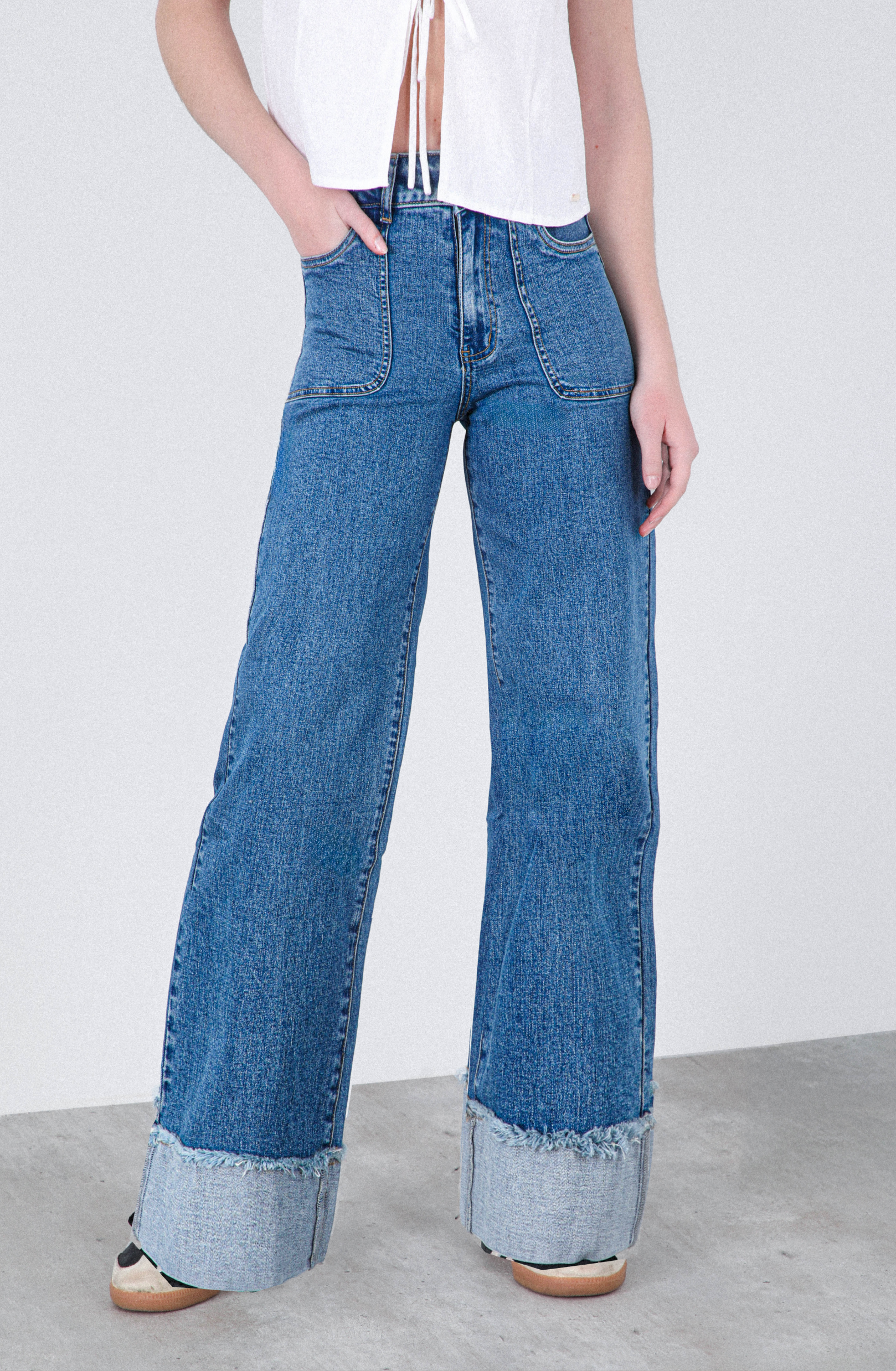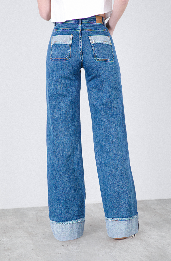Pantalón Wide Leg Sun Blue es un modelo de tiro medio con pierna ancha, que destaca por su silueta estructurada y sus terminaciones en denim a contratono. Posee basta ancha desflecada y bolsillos traseros con denim más claro, que aportan un aire relajado y original, sin perder elegancia.