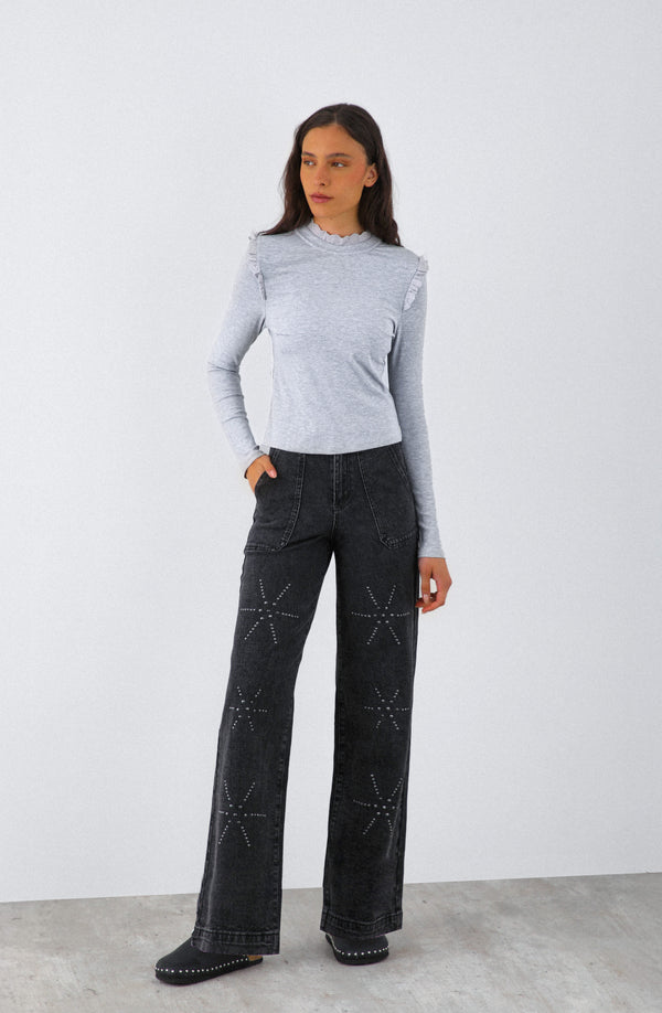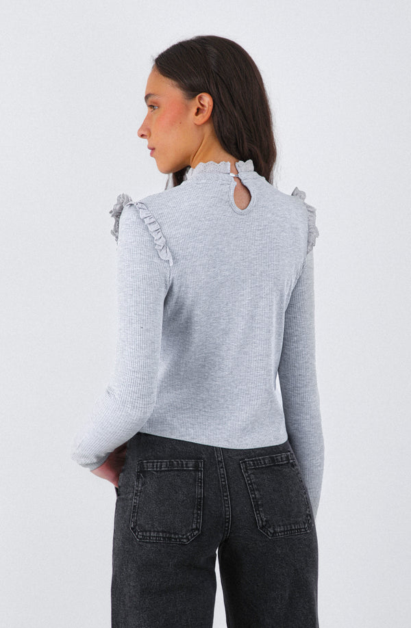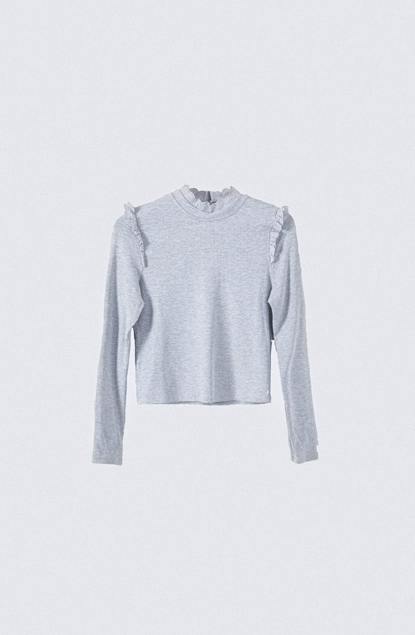 Polera de manga larga confeccionada en un tejido acanalado suave y elástico. Presenta detalles de vuelos en los hombros estilo broderie y un sutil acabado ondulado en el cuello del mismo estilo. Gracias a su mezcla de 98% algodón y 2% spandex , ofrece comodidad y libertad de movimiento. Disponible en blanco, beige y gris.