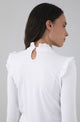 Polera de manga larga confeccionada en un tejido acanalado suave y elástico. Presenta detalles de vuelos en los hombros estilo broderie y un sutil acabado ondulado en el cuello del mismo estilo. Gracias a su mezcla de 98% algodón y 2% spandex , ofrece comodidad y libertad de movimiento. Disponible en blanco, beige y gris.