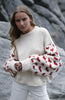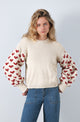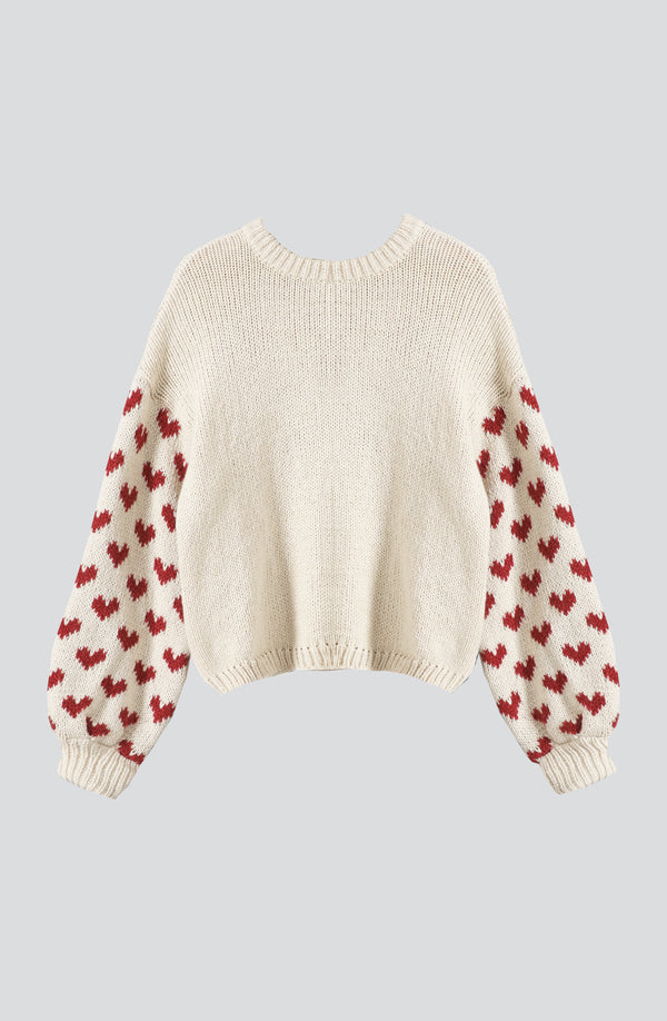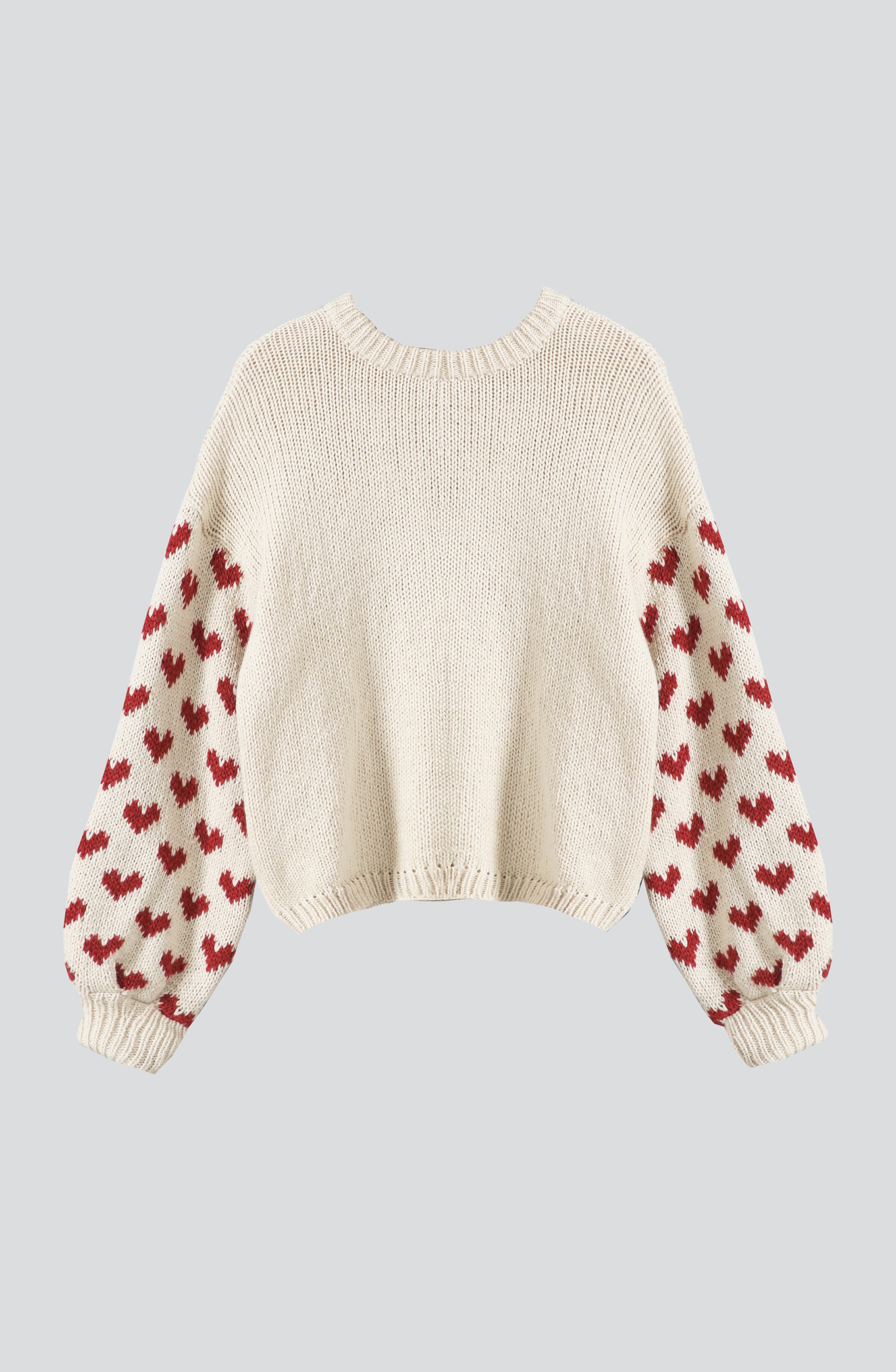 Diseñado y confeccionado en Chile, este sweater de punto combina un tono neutro con mangas llenas de pequeños corazones rojos. Su tejido de 60% lana, 20% acrílico y 20% poliamida logra un equilibrio entre calidez y suavidad, ideal para los días fríos.
