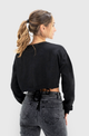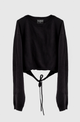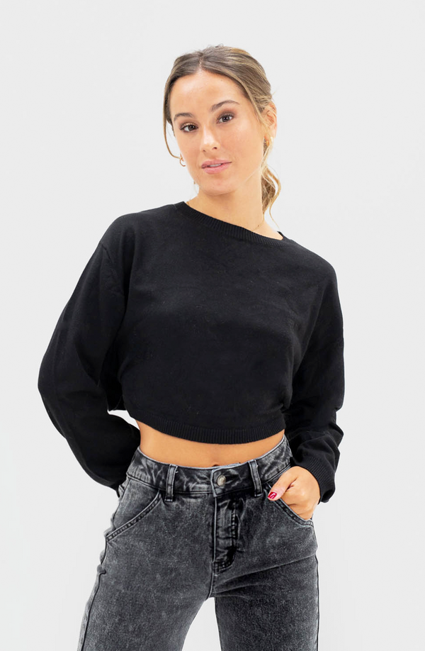 - Sweater o chaleco con mangas, corto estilo crop top y espalda descubierta.