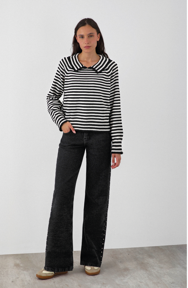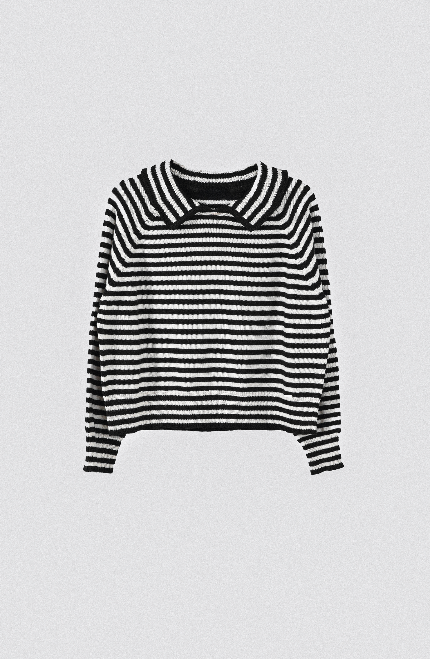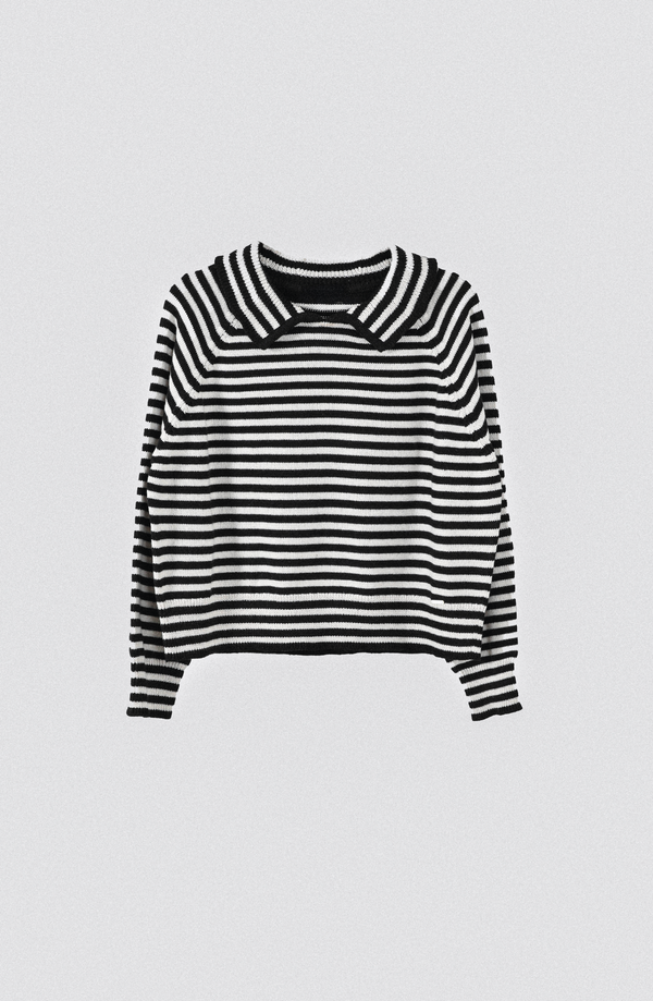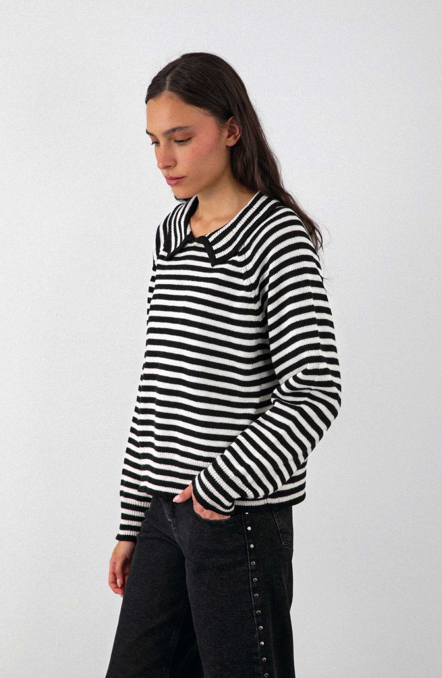 Suéter de manga larga con diseño a rayas en blanco y negro. Cuenta con un cuello tipo polo que le da un acabado distintivo. Su composición de 80% poliéster y 20% algodón. Ofrece una textura suave y ligera. Perfecto para combinar con jeans o pantalones de tela para un look casual.