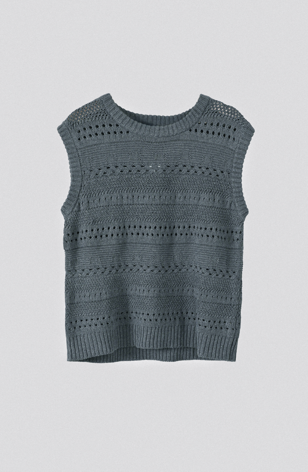 Chaleco tipo jersey de punto trenzado en color gris. Diseñado con un tejido calado que aporta textura y detalle a la prenda. Su composición de 70% algodón y 30% poliéster. ofrece y una sensación suave al tacto .Ofrece comodidad y una sensación suave al tacto. Ideal para usar sobre blusas o camisas para un look casual.