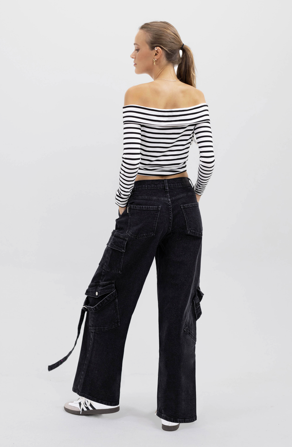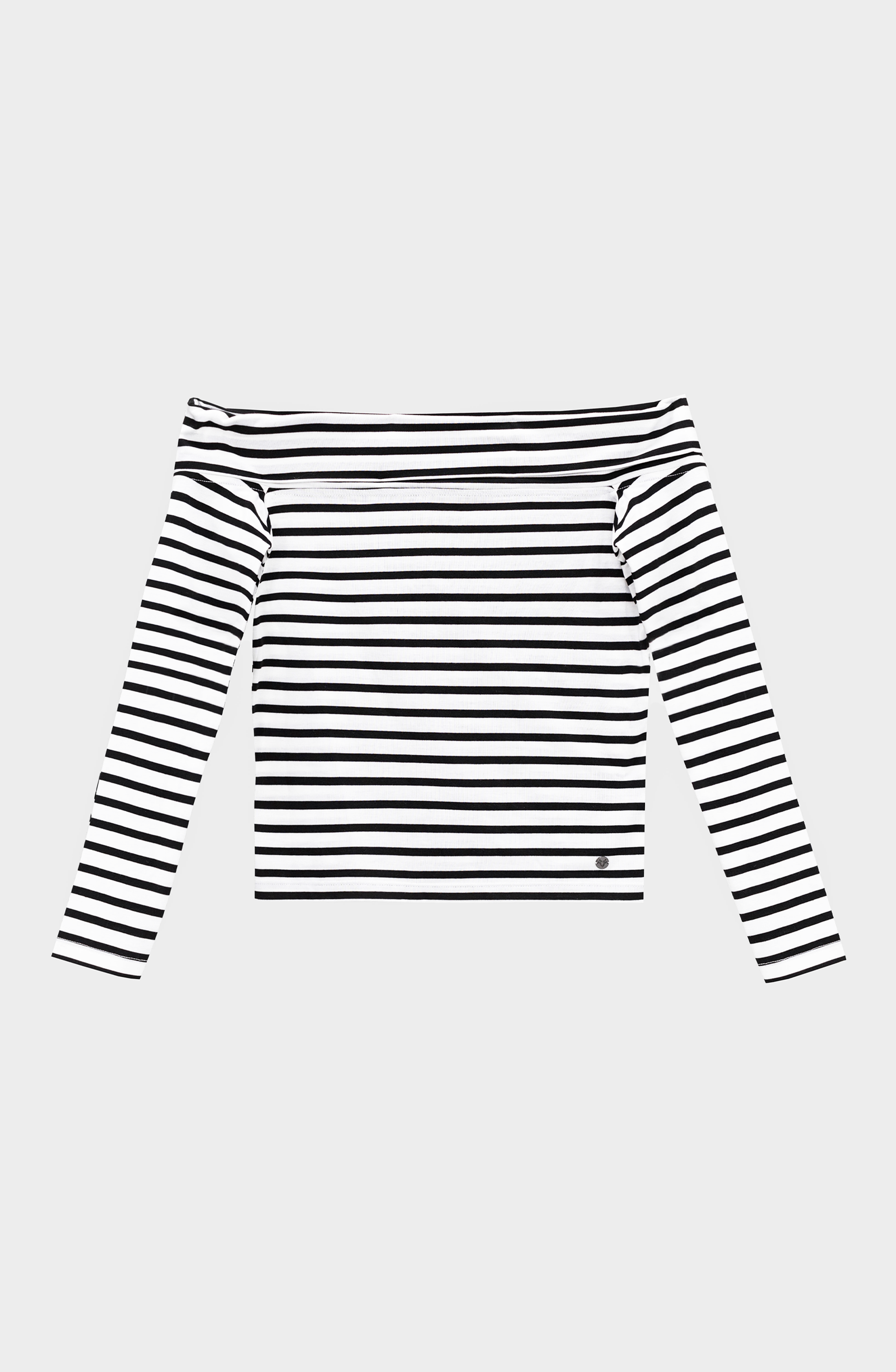 Nuevo top de manga larga y con hombros descubiertos tiene un calce que se ajusta a tu forma. Sus líneas en tonos blancos y negros se ajustan a cualquier idea de outfit.