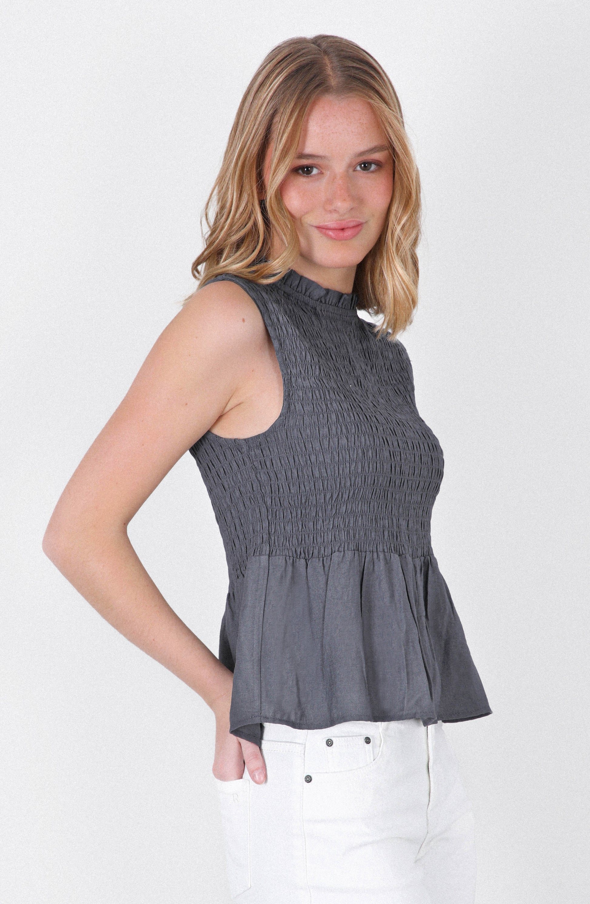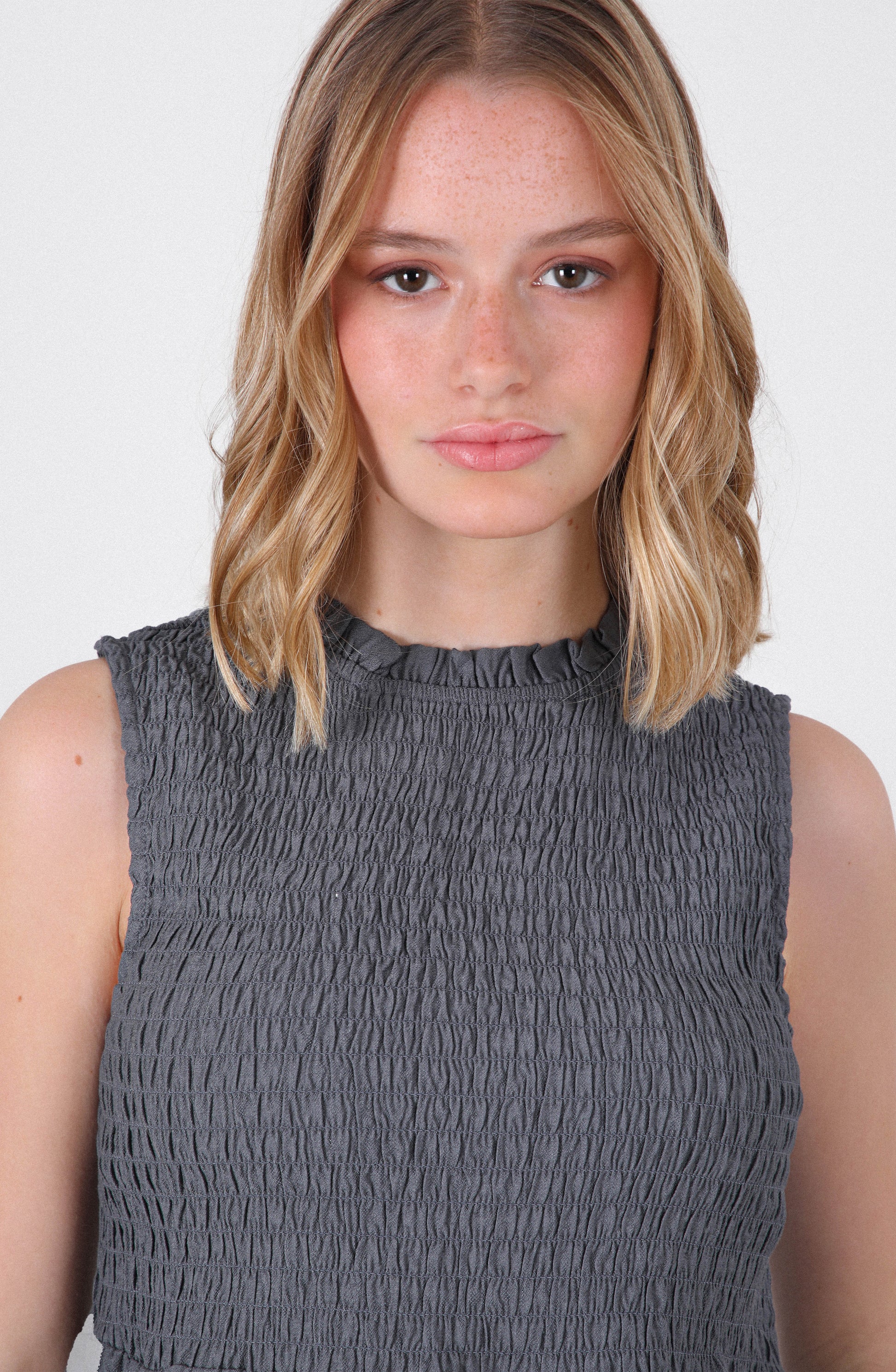 Top Panal Grey es una prenda liviana sin mangas, pensada para ofrecer un estilo casual y delicado a la vez. Su diseño combina un cuerpo con textura fruncida tipo panal y un vuelo inferior suelto, generando una silueta relajada que aporta movimiento. El cuello redondo con sutil detalle en el borde completa una propuesta fresca y cómoda para el día a día.