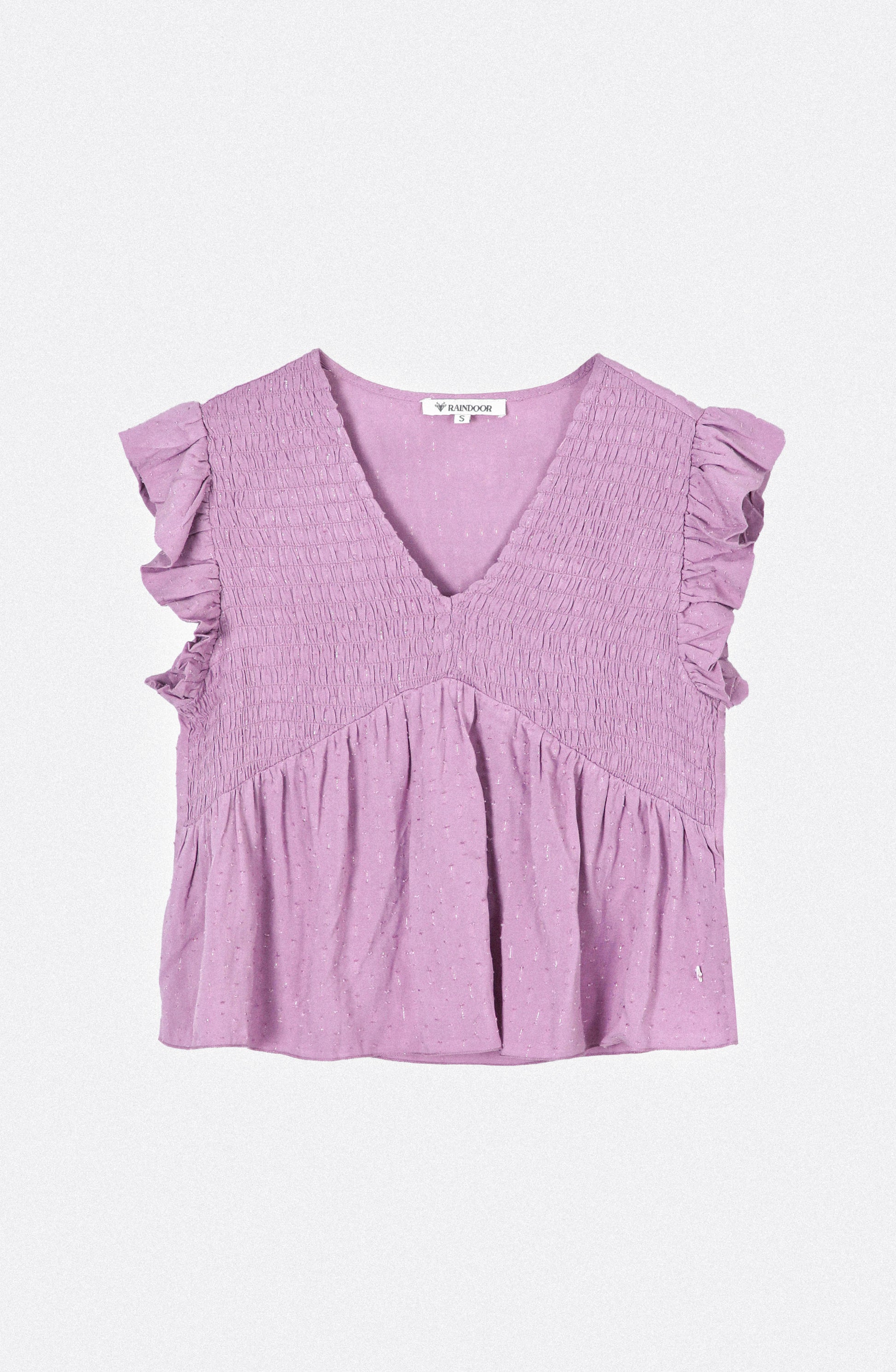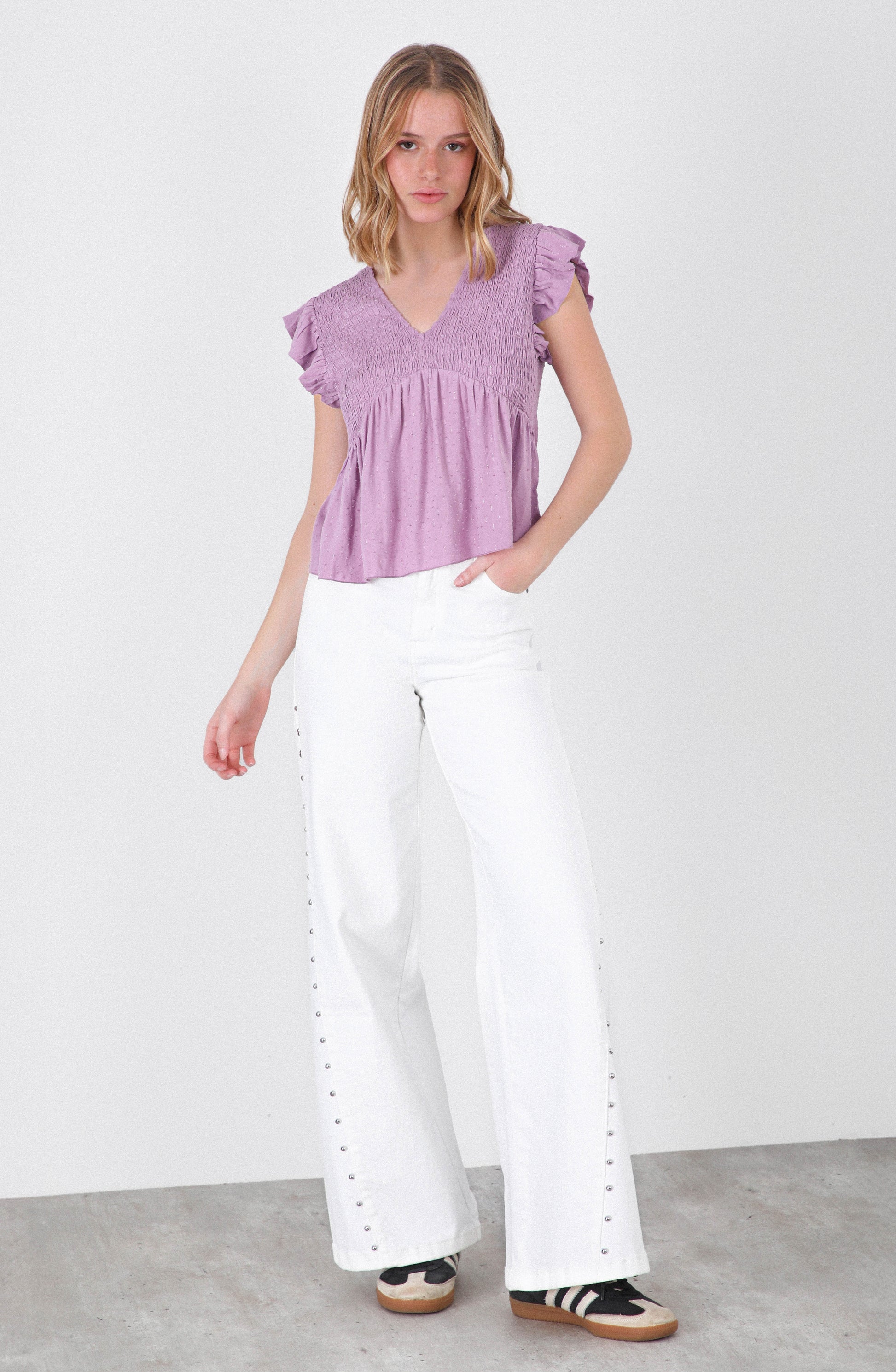 Top Panal Vuelos Lurex Pink es una prenda femenina y liviana, con escote en V y frunces que destacan la parte superior del torso. Las mangas cortas con vuelos aportan un movimiento delicado que enmarca los hombros de manera sutil y favorecedora.