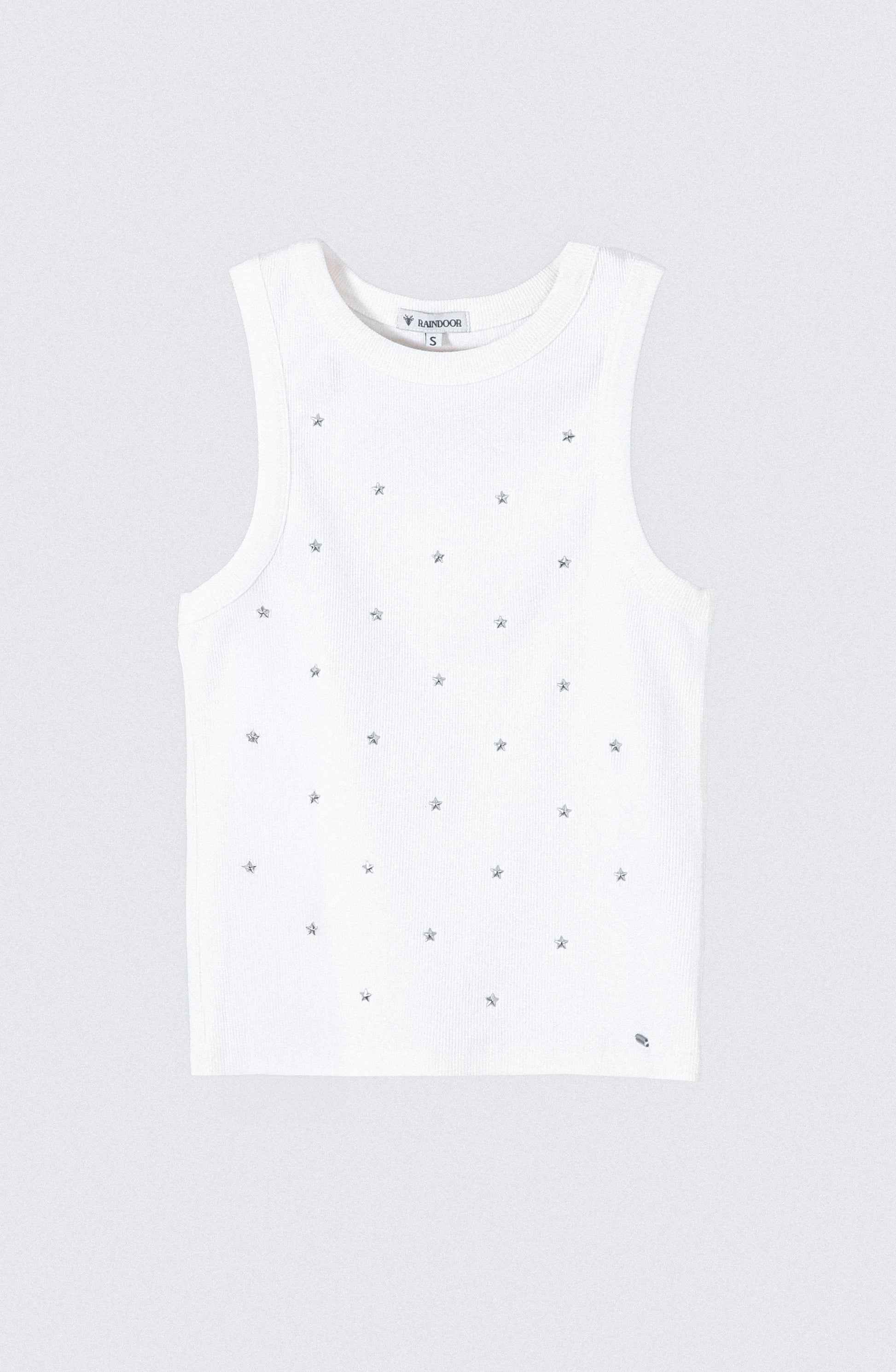 Está confeccionado en algodón acanalado en tono blanco, suave y flexible, decorado con un bordado frontal de pequeñas estrellas metálicas que le dan un aire delicado y juvenil. Ideal para elevar un outfit sencillo con un toque sutil.