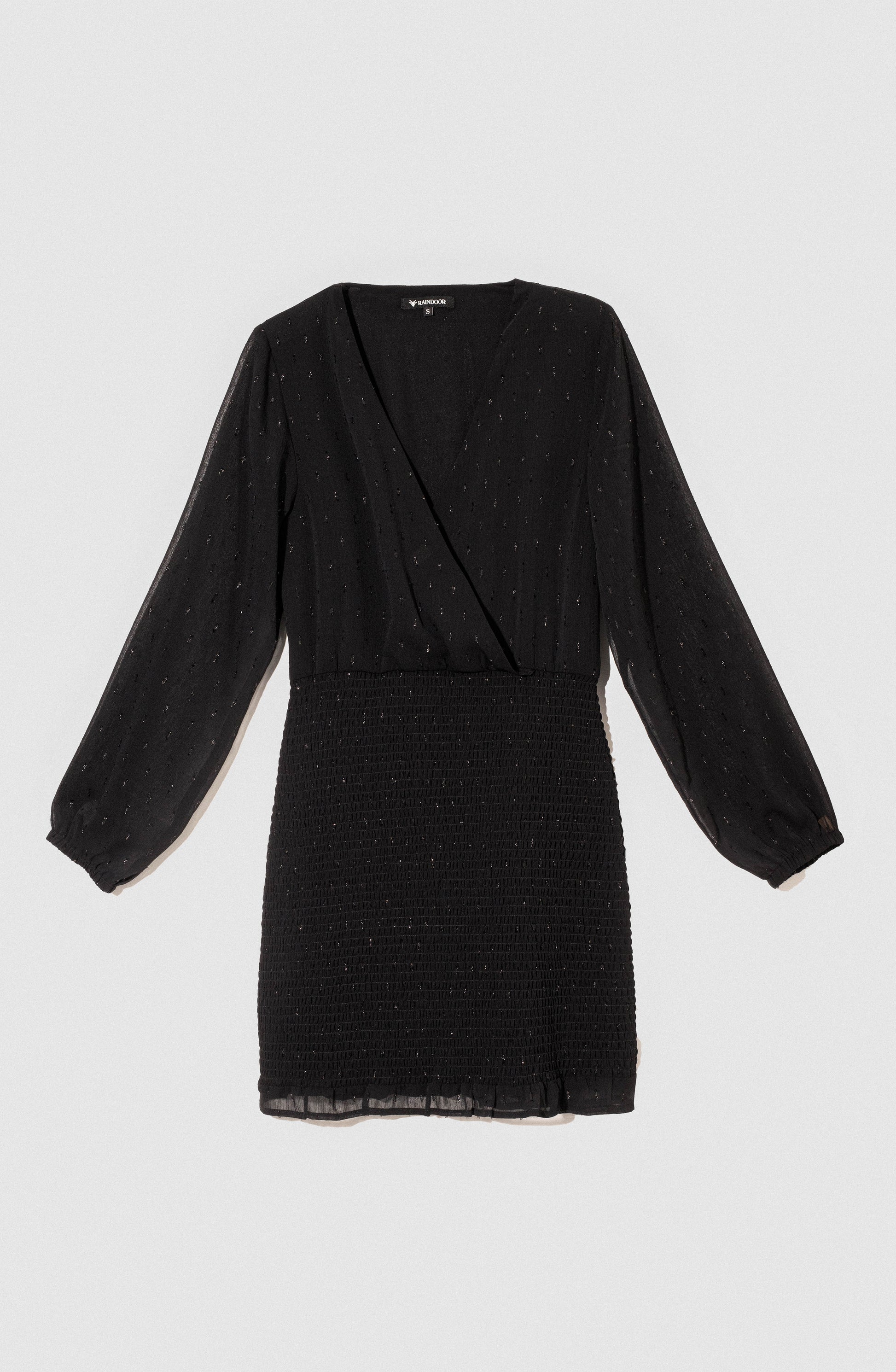 El Vestido Panal Negro Manga Larga de Raindoor es una prenda versátil que combina frescura y elegancia con un toque especial. Su diseño panal, que se adapta cómodamente al cuerpo, está decorado con pequeños detalles de lurex dorados que le añaden un sutil brillo, creando un look sofisticado y moderno.